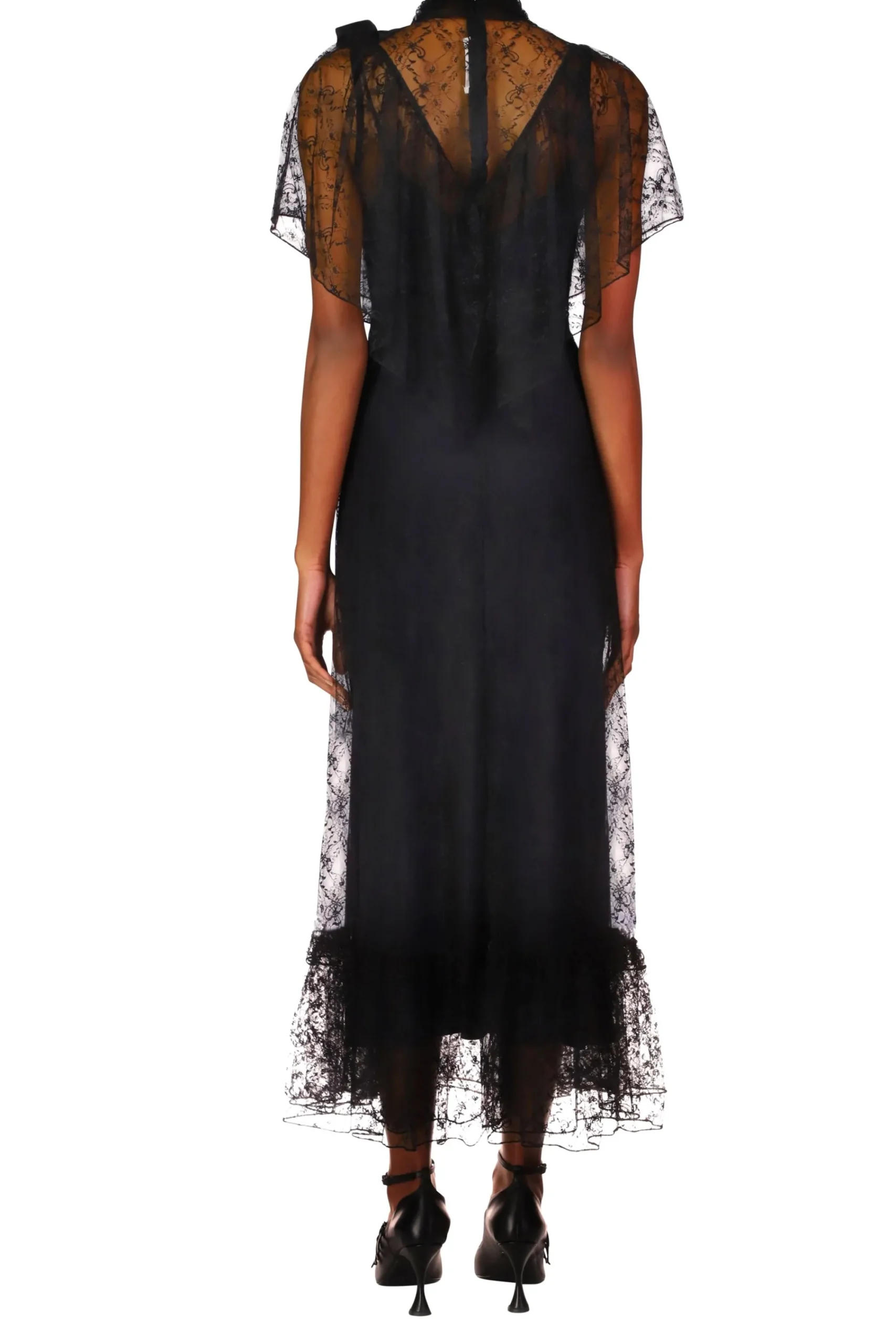 Make A Striking Statement With This Dress Cut From Sheer Black Floral Lace Lined With A Black Silk Bias Slip. An Oversized Collar Of The Same Transparent Lace Cascades From A Band At The Neck And Is Accented By A Hand Molded Silk Flower Corsage At The Neckline. This Feminine Maxi Features A V-Neckline And A Wide Ruffle At The Hemline.