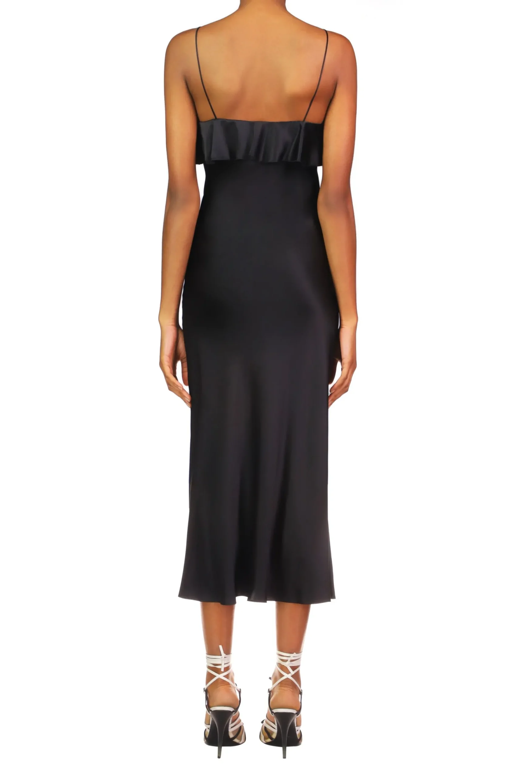 A Silk Rose Adorns The Ruffled Neckline Of This Minimalist Slip Dress. Cut On The Bias From Lustrous Black Pure Silk Charmeuse, This Midi Offers A Streamlined Silhouette That Follows Your Body’S Curves Without Clinging.