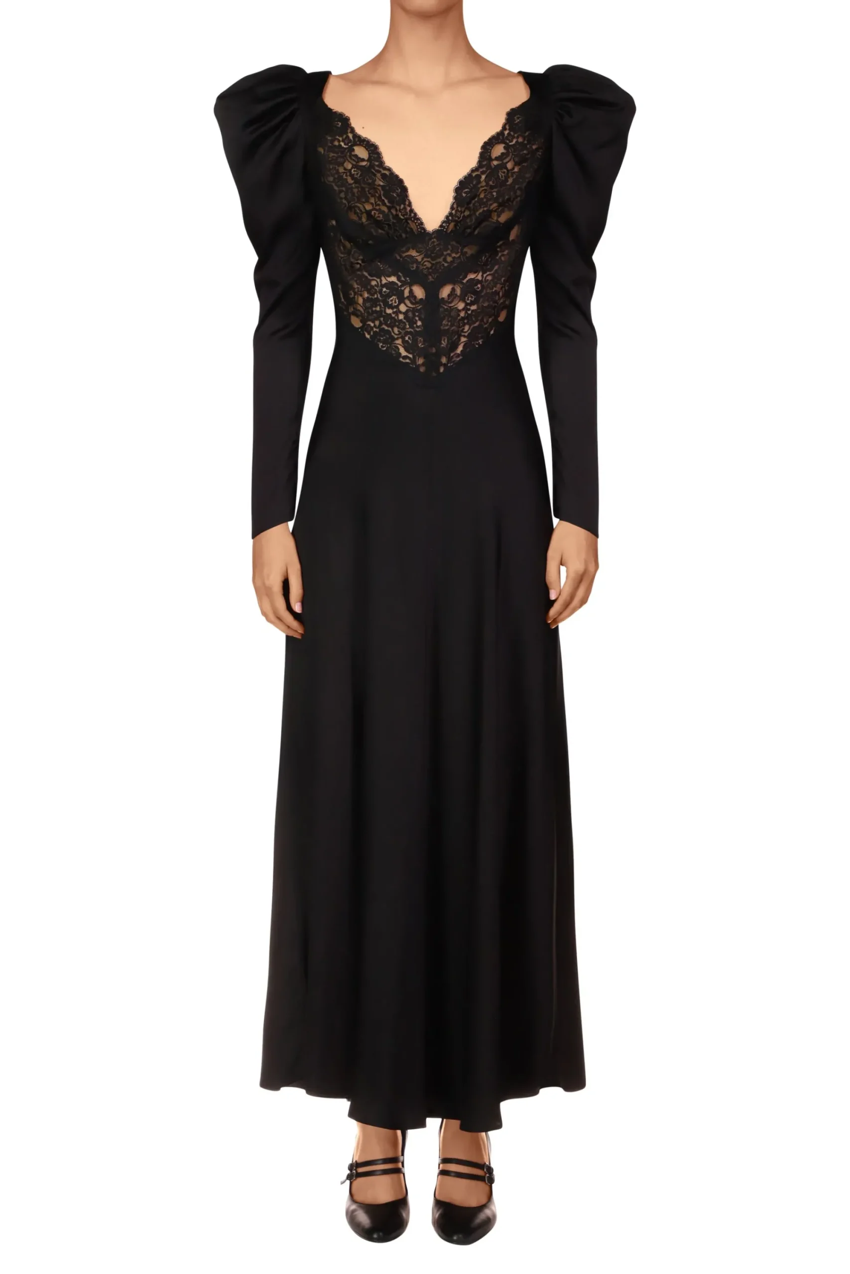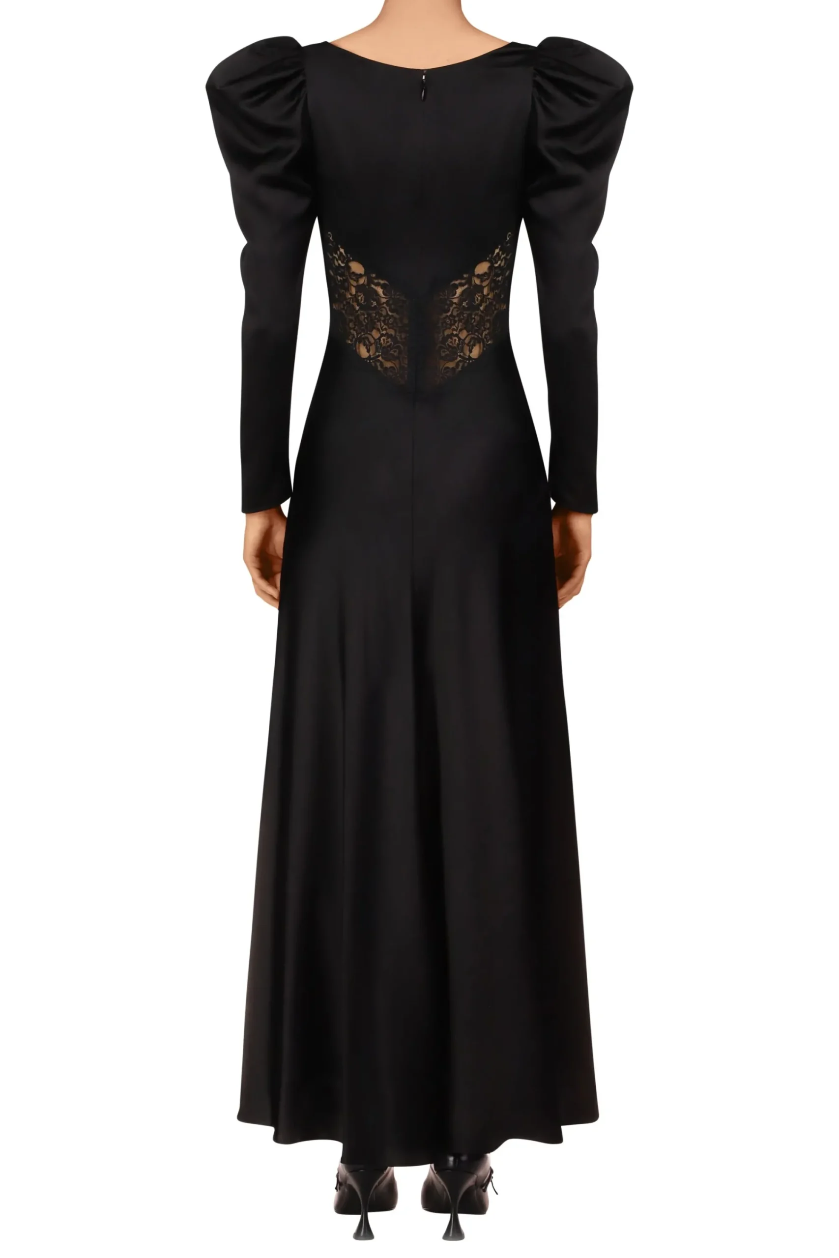 Cut From Lustrous Black Silk Charmeuse, This Sophisticated Maxi Features A Fitted Bodice Made Of Delicate Black Cotton Lace. Victorian Mutton Sleeves Tapered To Narrow Wrists, A Defined Waist And A Gently Flowing Bias Cut Skirt Combine To Create A Strong Silhouette.