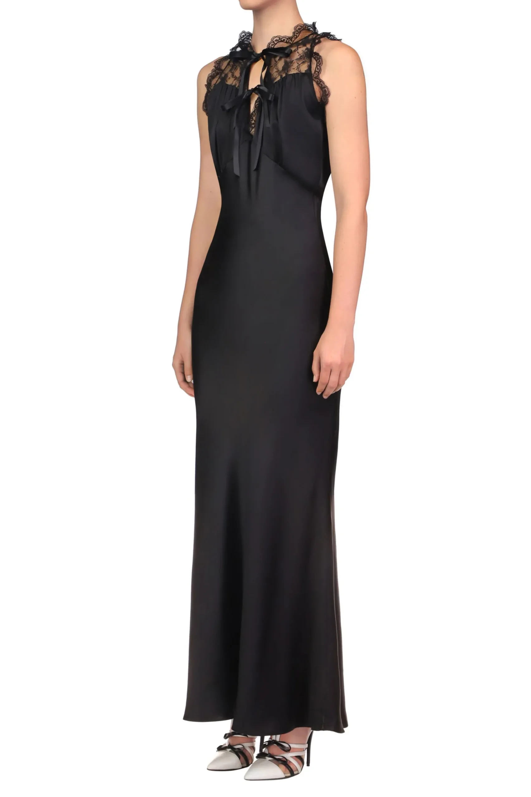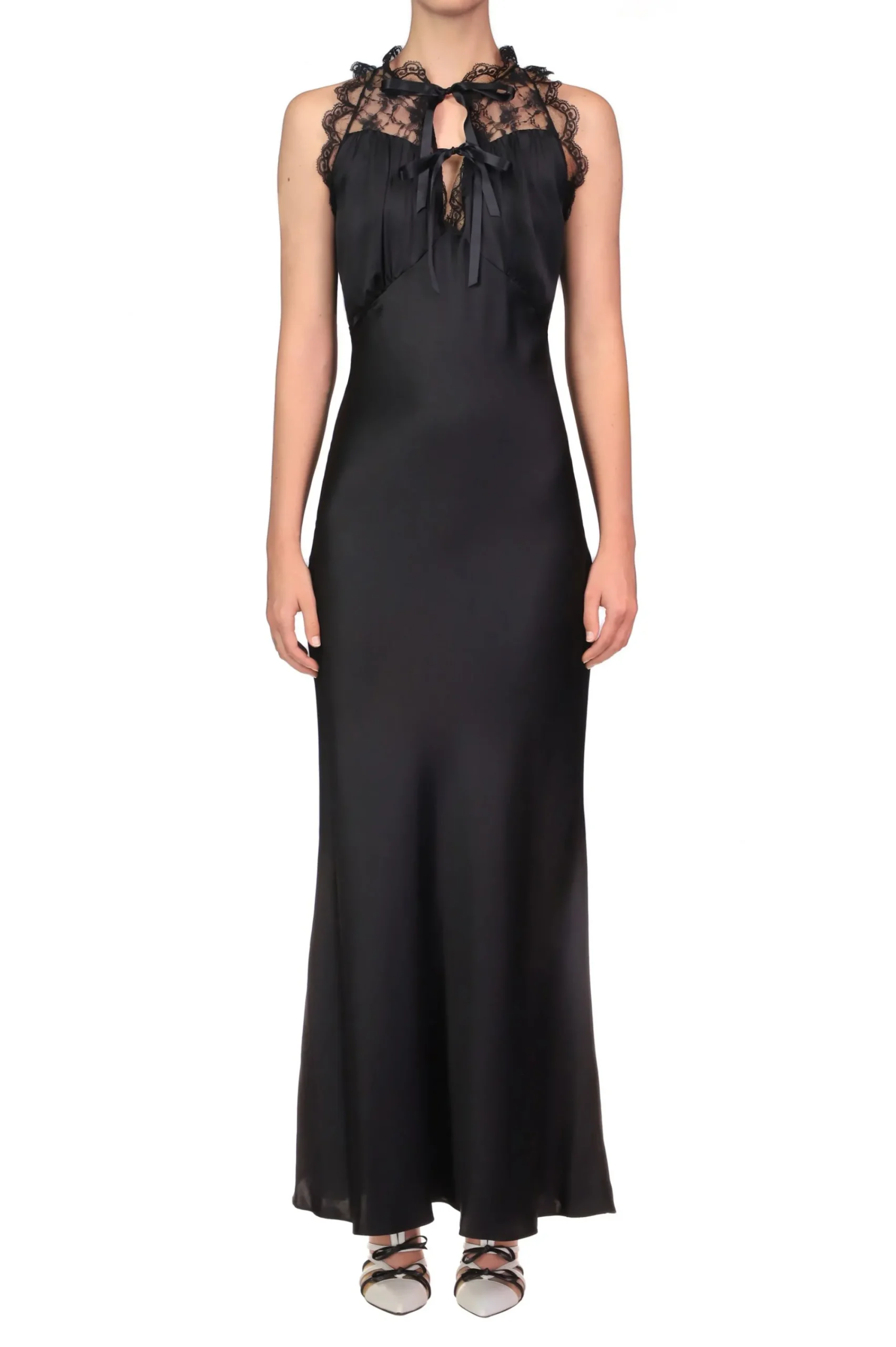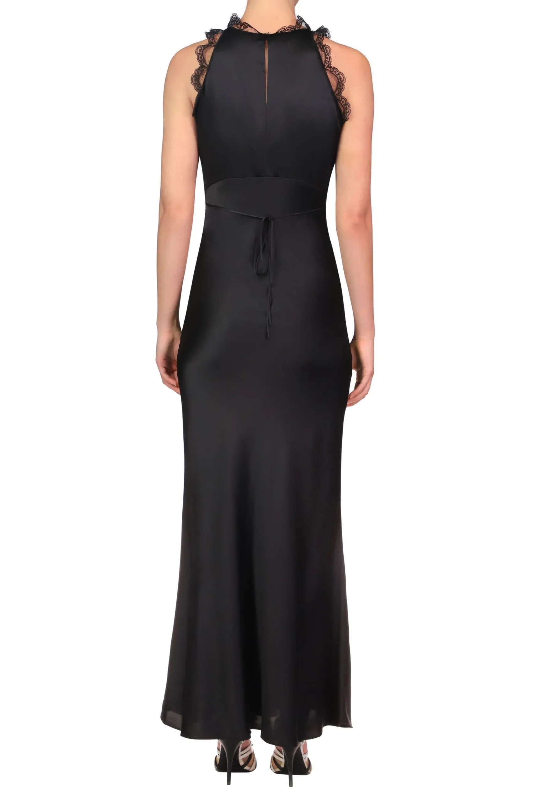 Cut On The Bias In Lustrous Black Silk Charmeuse, This Bias Cut Dress Features A Yoke Of Intricate Gossamer Black Lace, Echoed By Ruffles Of Black Lace Trim Along The Halter Neckline. The Empire Waistline Has Thin Ribbons Of Black Silk That Tie In The Back For A Slim Fit That Gently Flares To A Maxi Length.