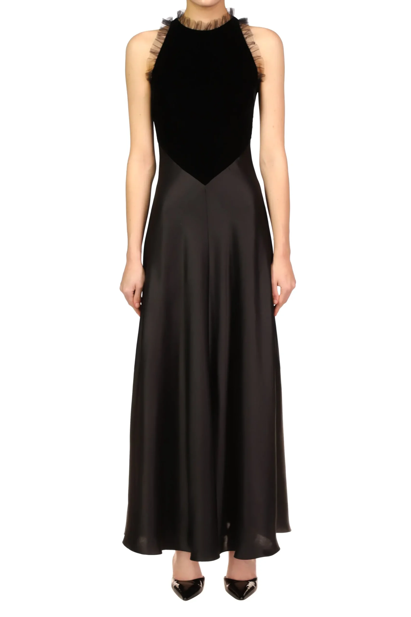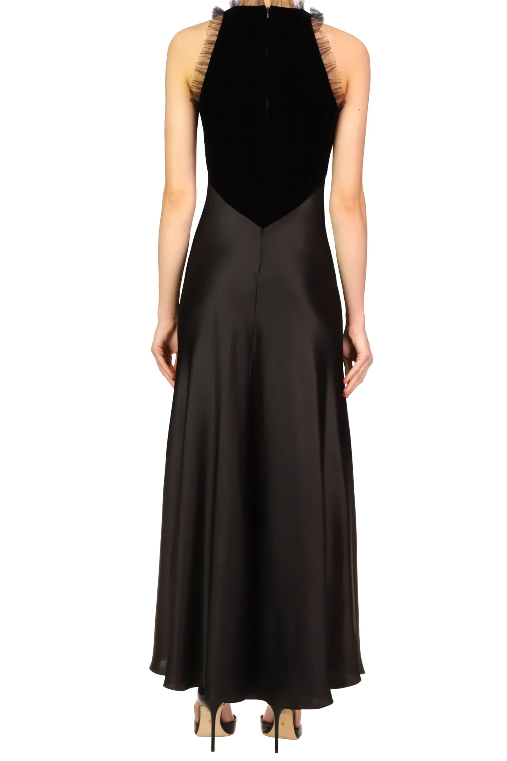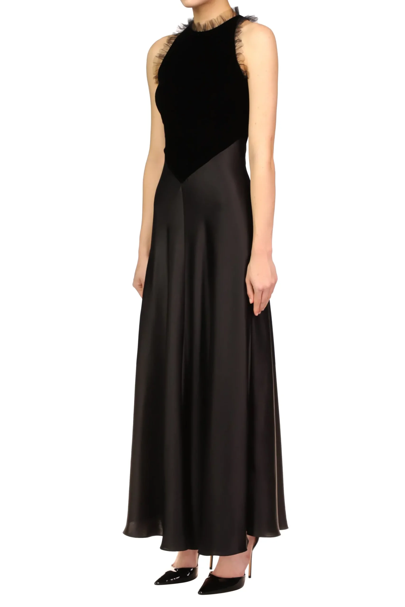 This Elegant Maxi Features A Fitted Bodice Cut From Black Velvet That Spills Into A Black Silk Charmeuse Flared Skirt Cut On The Bias. Its Tailored Construction And Dropped V Waistline Are Emphasized With Sheered Tulle Trim.