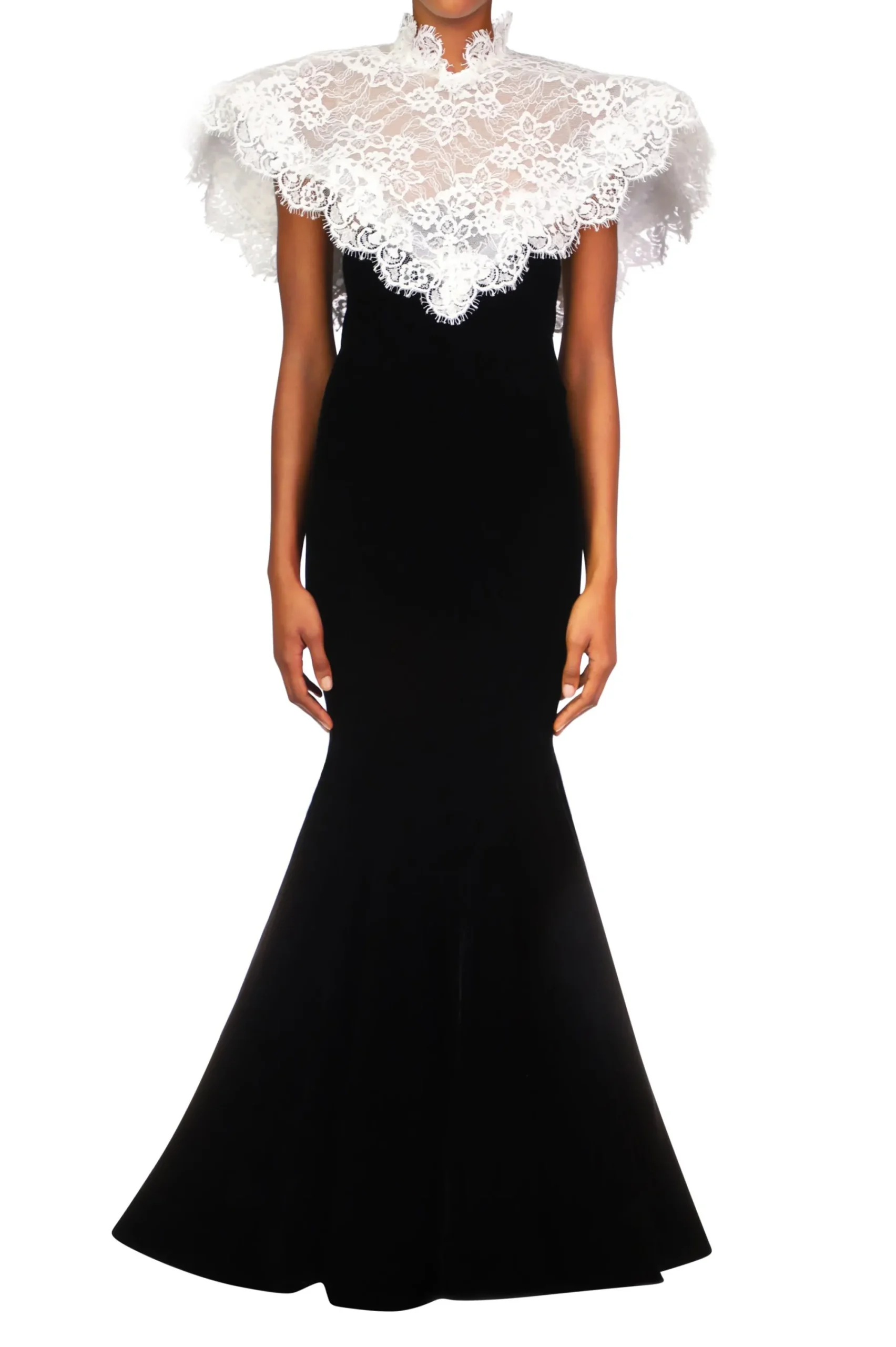 Impeccably Tailored In Black Velvet, This Dramatic Evening Gown Is Secured By Illusion Tulle And Flares From The Knee To Floor Skimming Hemline, Perfectly Finished With An Oversized High Neckline Collar Cut From Sheer Corded Off-White Lace Edged In Scalloped Lace.