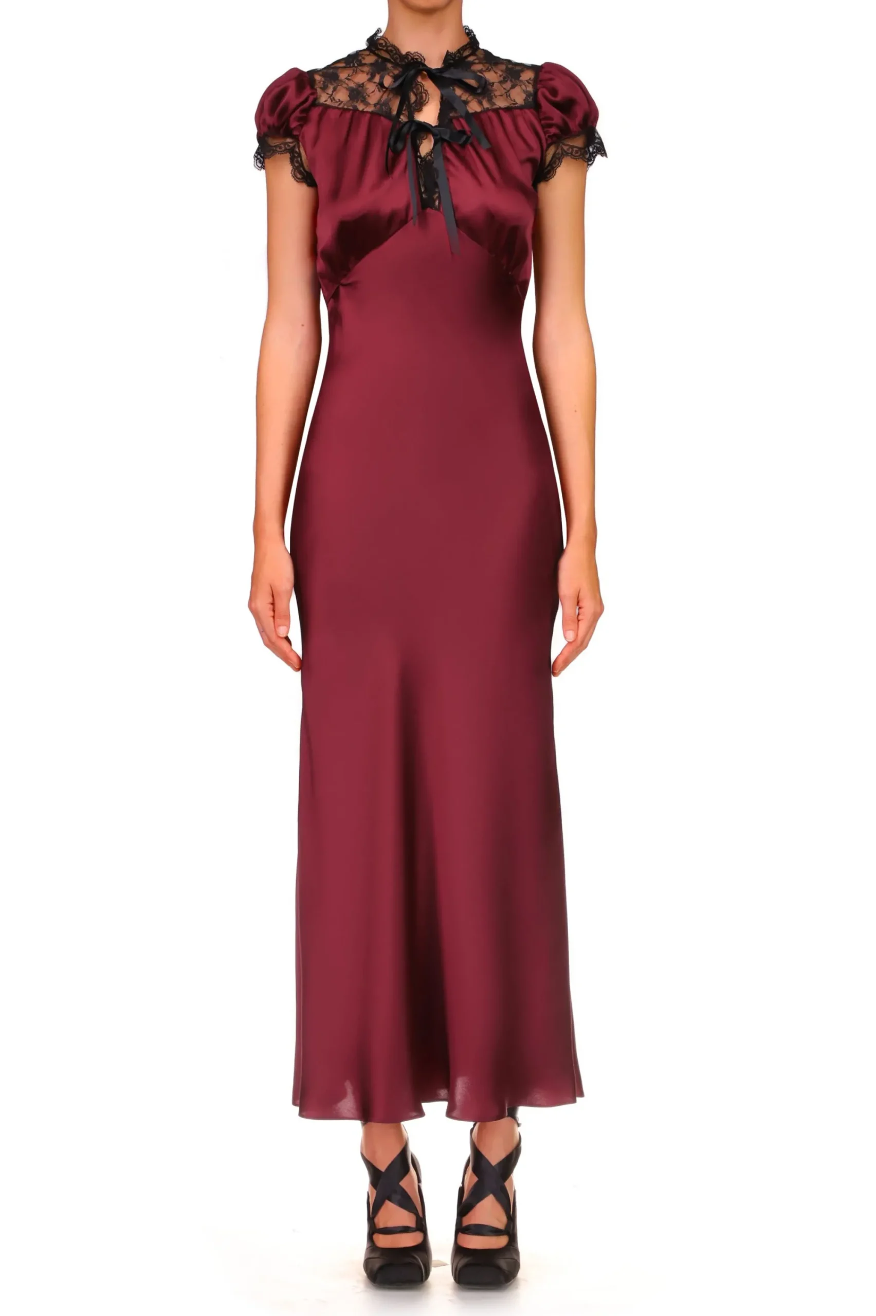Cut On The Bias In Lustrous Burgundy Silk Charmeuse, This Elegant Dress Features A Yoke Of Intricate Gossamer Black Lace, Echoed By Black Lace Trim On Its Short Puff Sleeves And V-Neckline, Accented With Black Bow Closures. The Empire Waistline Has Thin Ribbons Of Green Silk That Tie In The Back For A Slim Fit That Gently Flares To A Maxi Length With A Graceful Drape.
