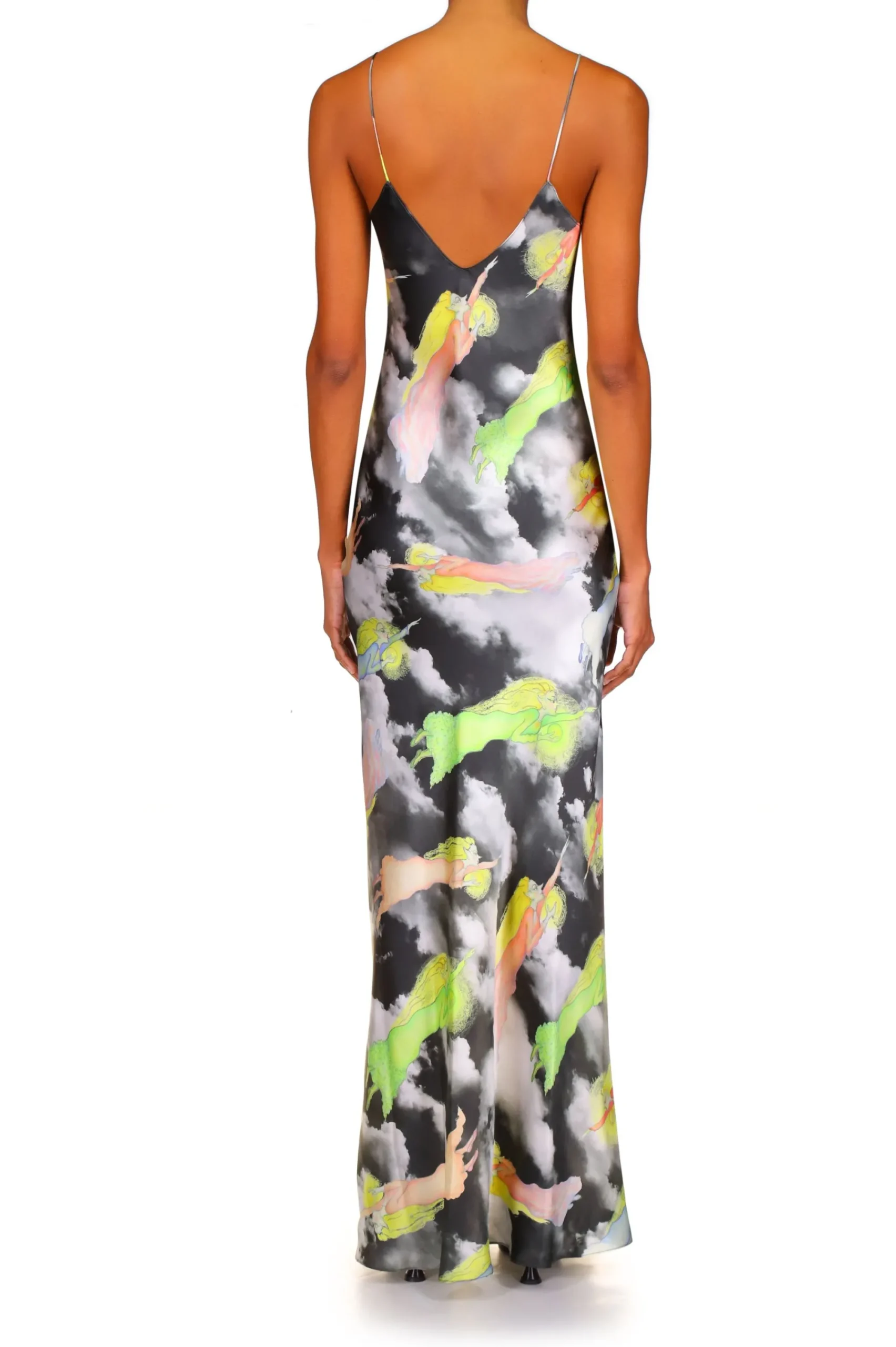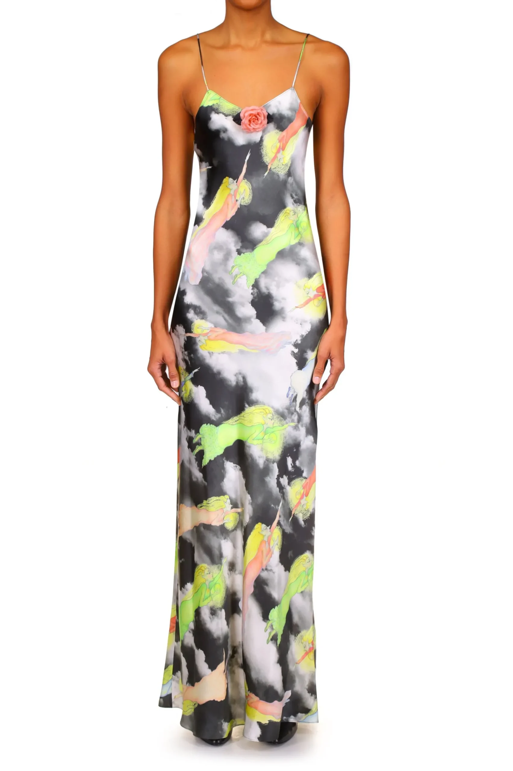 Cut On The Bias From Lustrous Silk Charmeuse Scattered With Flying Fairies Printed On A Black And White Cloudy Sky, This Gown Length Slip Dress Is Anchored By Spaghetti Straps And Adorned With A Hand Molded Silk Flower At The Neckline. This FAnciful Fairy Artwork Was Made By Artist Victoria Mulleavy, Mother Of Rodarte Duo Kate And Laura Mulleavy, In A Familial Collaboration.
