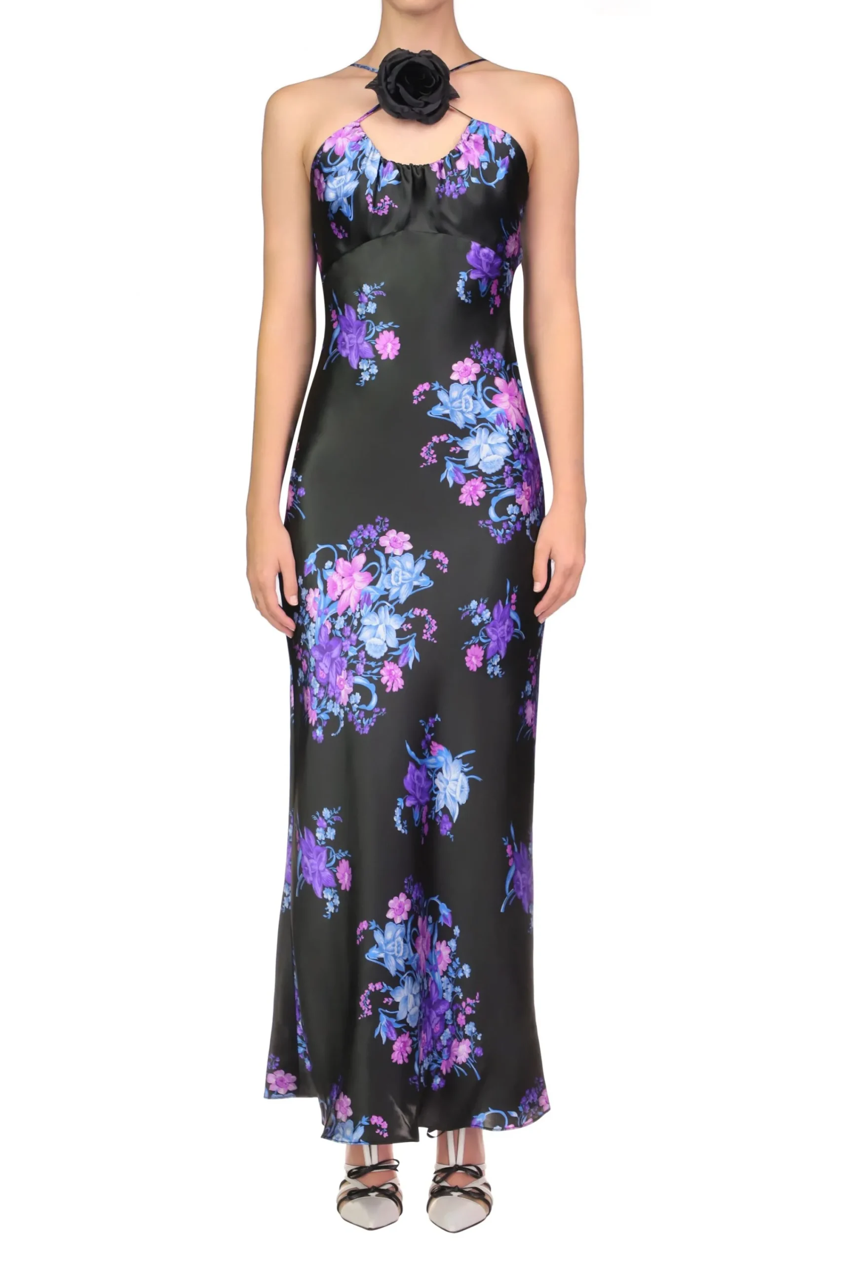 Cut On The Bias In Lustrous Floral Printed Silk Charmeuse, This Bias Cut Dress Features A Ruched Empire Cut, Echoed By An Elasticized Halter Neckline, That Closes Together With A Large Silk Rosette. The Empire Waistline Gently Flares Into A Maxi Length With A Graceful Drape.