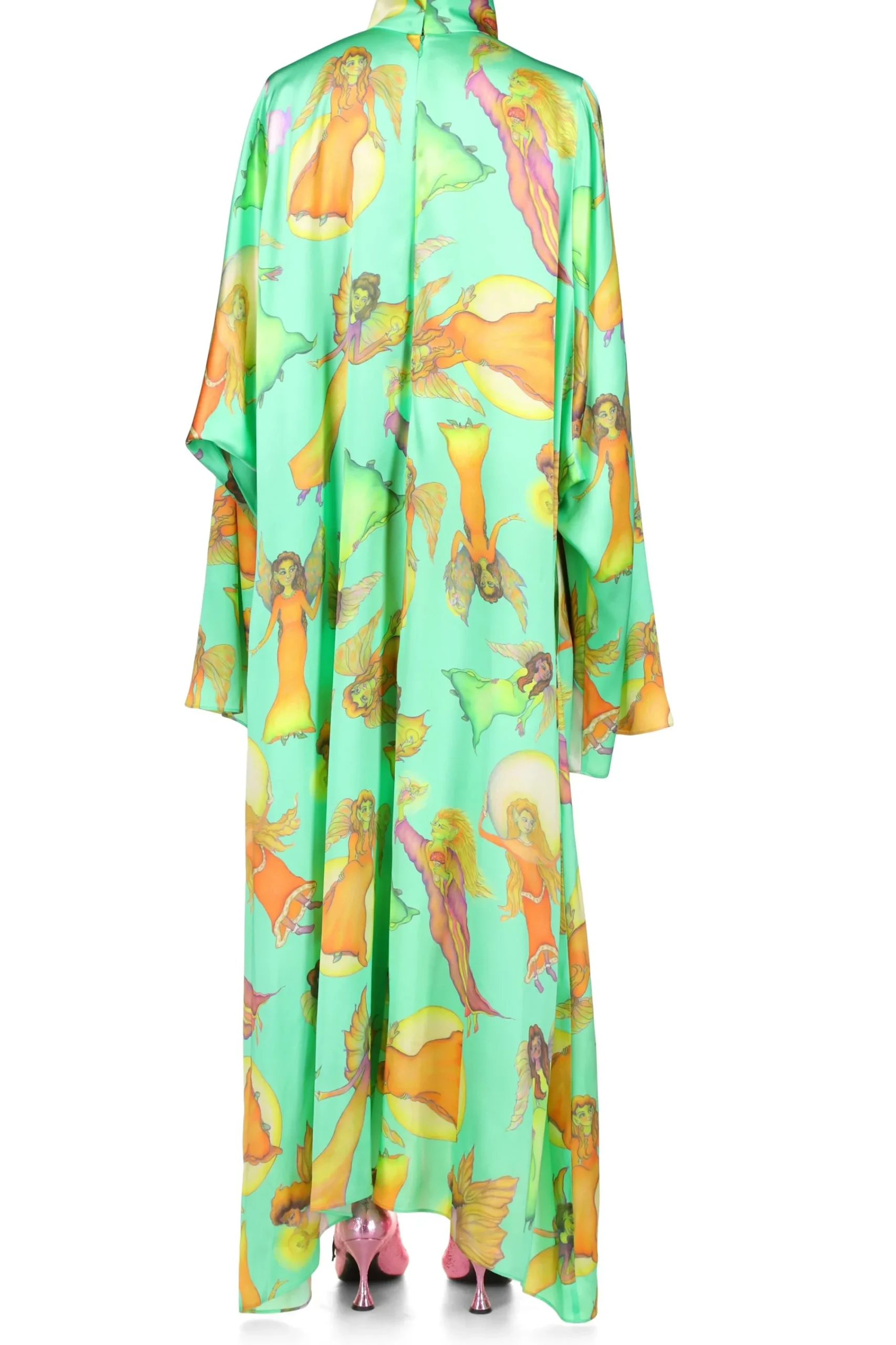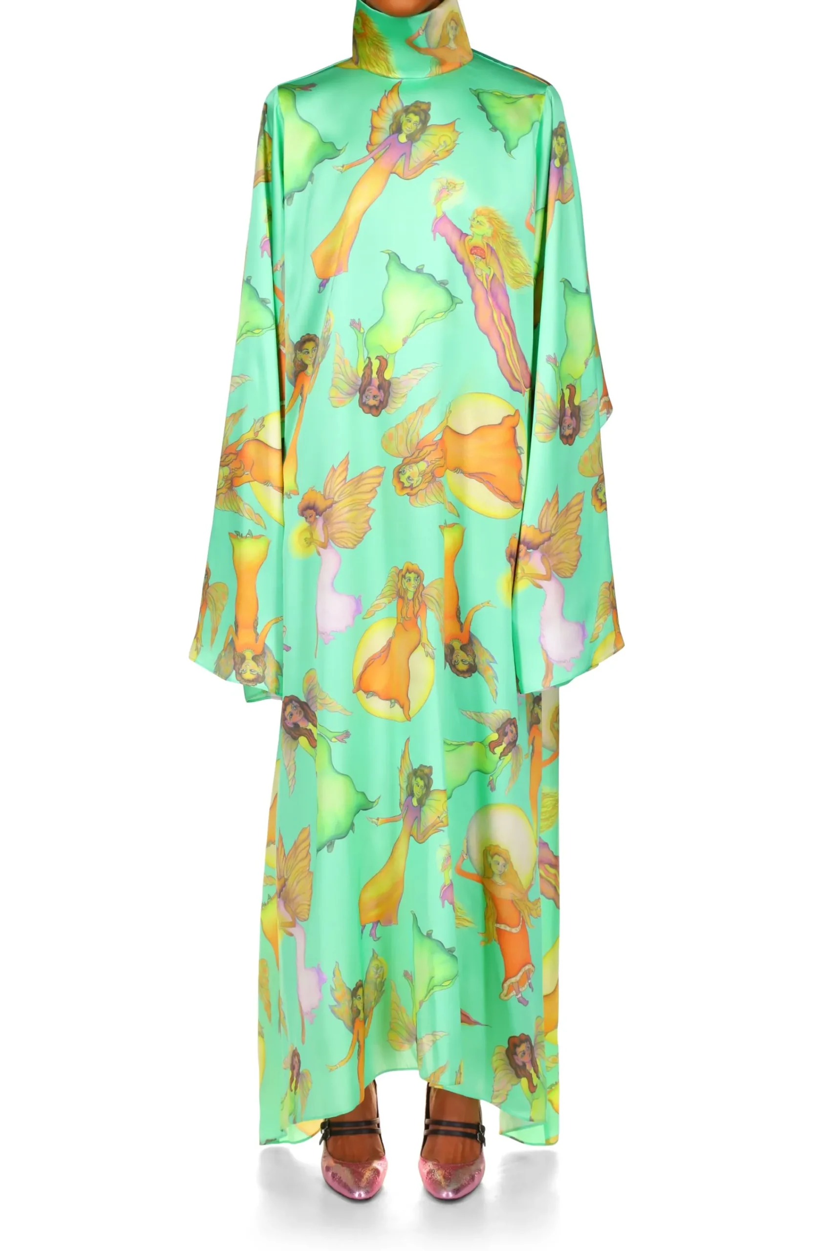The Free-Floating Silhouette Of This Captivating Tunic Dress With Its Elongated Sleeves And Folded Turtle Neckline Comes To Life In Movement. Cut From Green Silk Charmeuse Printed With An Assortment Of Fanciful Fairies Designed By Artist Victoria Mulleavy, Mother Of Rodarte Duo Kate And Laura Mulleavy, In A Familial Collaboration.