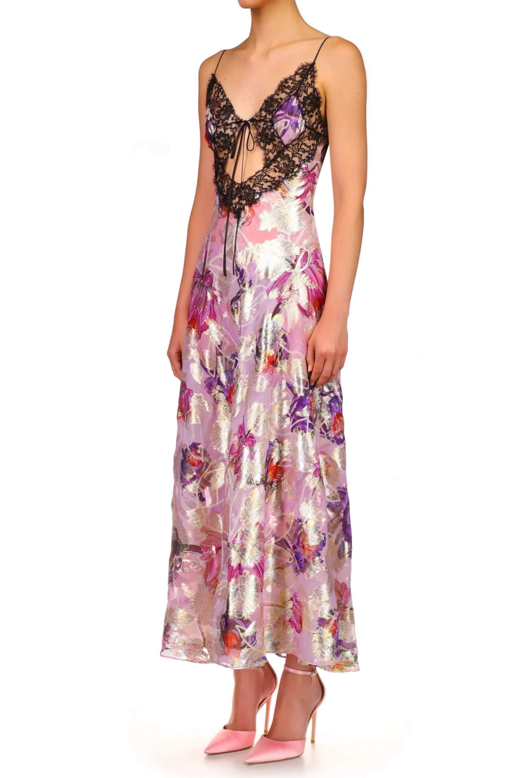 Glimmering Lurex Jacquard Imparts A Sophisticated Sheen To This Lavender Floral Print Bias Slip Dress.Diamond Shaped Cups Outlined With Rich Black Tulle Lace And Secured By Pin-Thin Straps And A Black Bowcreate A Distinctive Cutout Beneath A V-Neckline. Complete The Look Of This Elegant Ankle-Skimming Dresswith Our Lavender Iris Pin Hand Molded From The Same Fabric.
