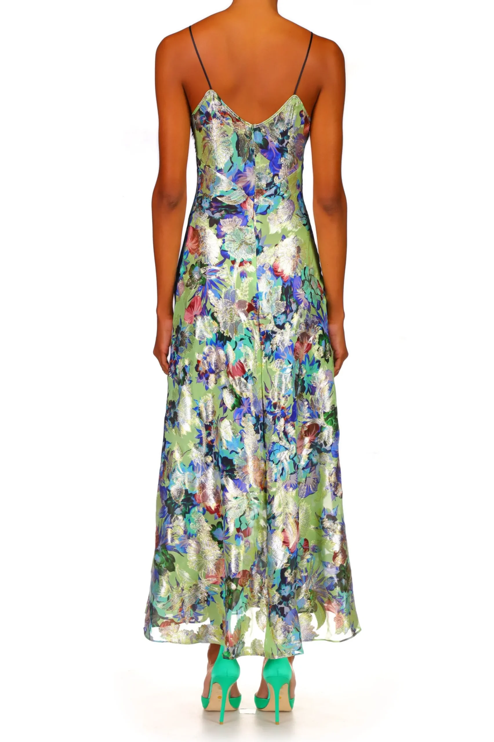 Glimmering Lurex Jacquard Imparts A Sophisticated Sheen To This Mint Green Floral Print Bias Slip Dress.Diamond Shaped Cups Outlined With Rich Black Tulle Lace And Secured By Pin-Thin Straps And A Black Bowcreate A Distinctive Cutout Beneath A V-Neckline. Complete The Look Of This Elegant Ankle-Skimming Dresswith Our Mint Iris Pin Hand Molded From The Same Fabric.