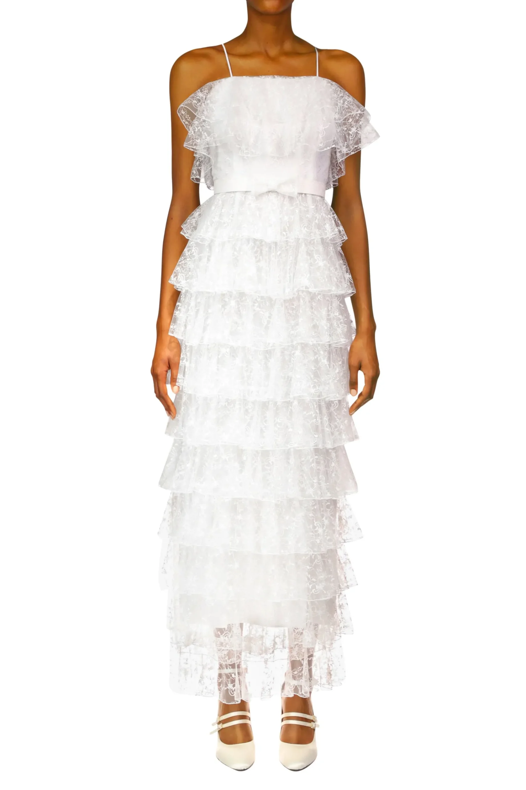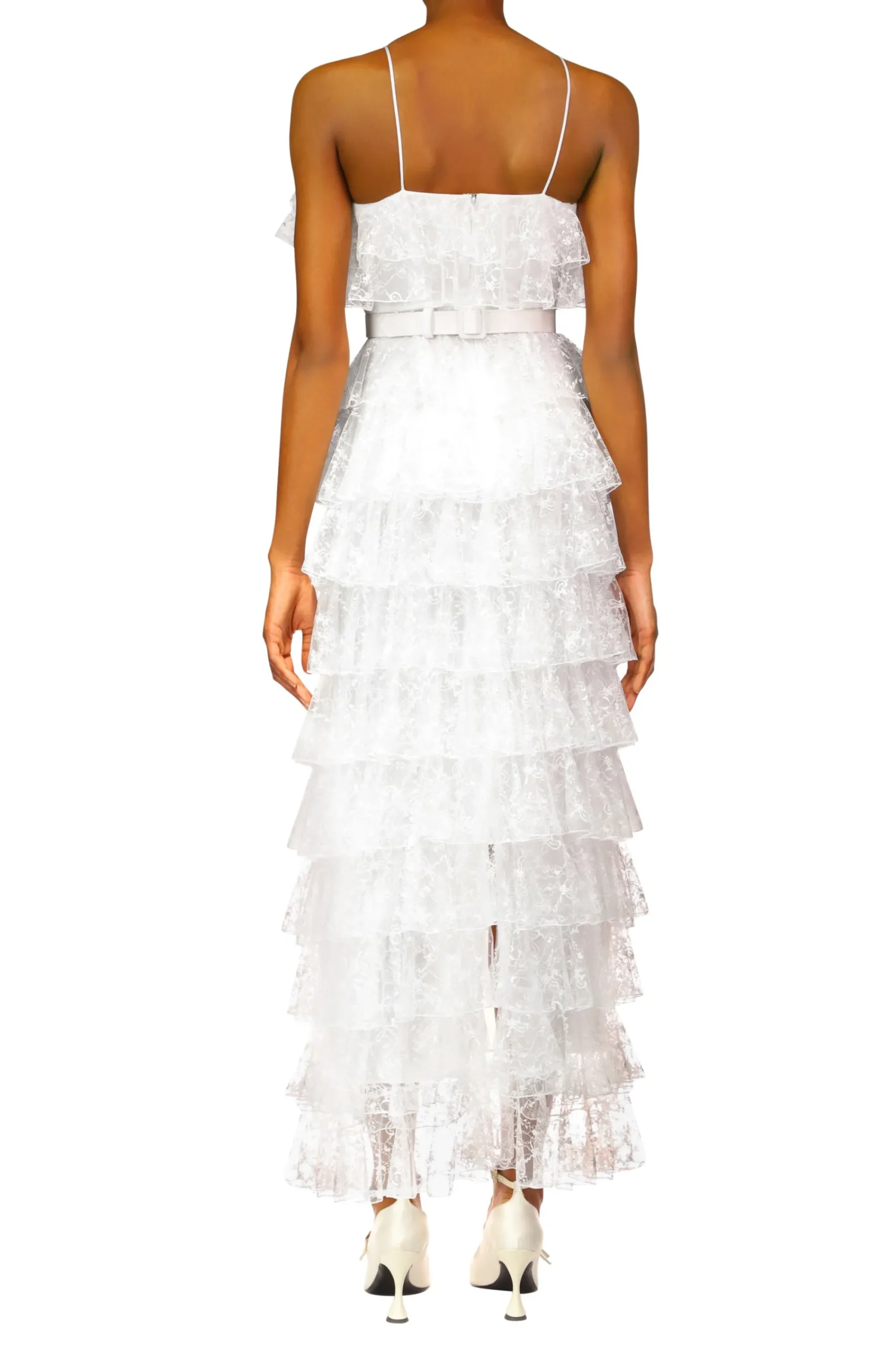 This Lace Tulle Tiered Dress Features A Fitted Bodice, Delicate Straps, And Layers Of White Floral Tulle Ruffles At Its Straight Neckline. Its Waistline Is Defined By A Self-Belt With A Bow Atop A Slightly Flared Skirt Adorned With Tiers Of Frothy Tulle Ruffles. Lined In Off White Silk Crepe De Chine. This Style Is Sold With A Matching Scarf And Hand Molded Silk Flower Pin.