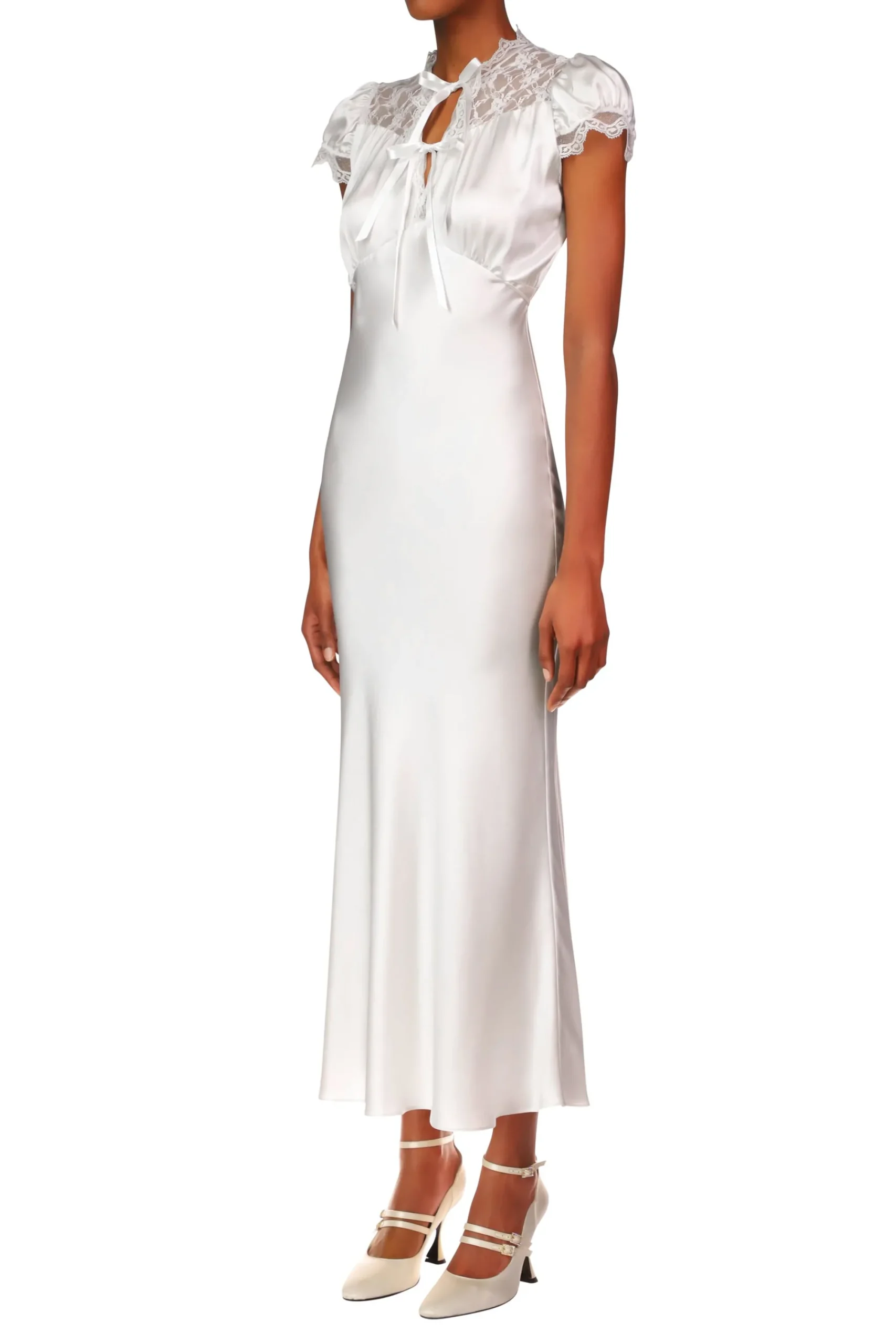 Cut On The Bias In Lustrous Off White Silk Charmeuse, This Elegant Dress Features A Yoke Of Intricate Gossamer White Lace, Echoed By Scalloped Lace Trim On Its Short Puff Sleeves And V-Neckline, Accented With White Satin Bow Closures. The Empire Waistline Has Thin Off White Silk Straps That Tie In The Back For A Slim Fit That Gently Flares To A Maxi Length With A Graceful Drape.