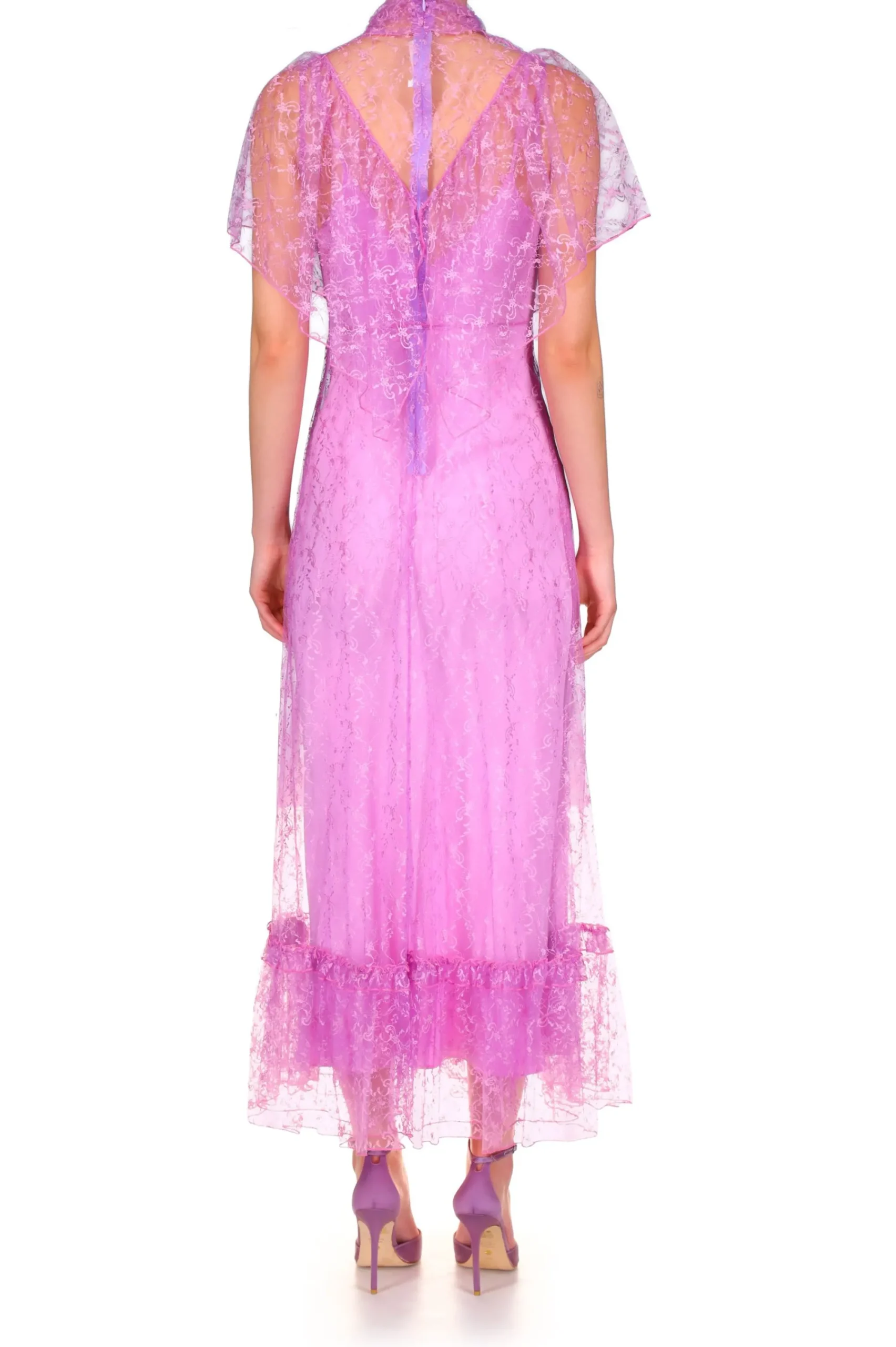 Make A Striking Statement With This Dress Cut From Sheer Orchid Purple Floral Lace Lined With An Orchid Purple Silk Bias Slip. An Oversized Collar Of The Same Transparent Lace Cascades From A Band At The Neck And Is Accented By A Hand Molded Silk Flower At The Neckline. This Feminine Maxi Features A V-Neckline And A Wide Ruffle At The Hemline.