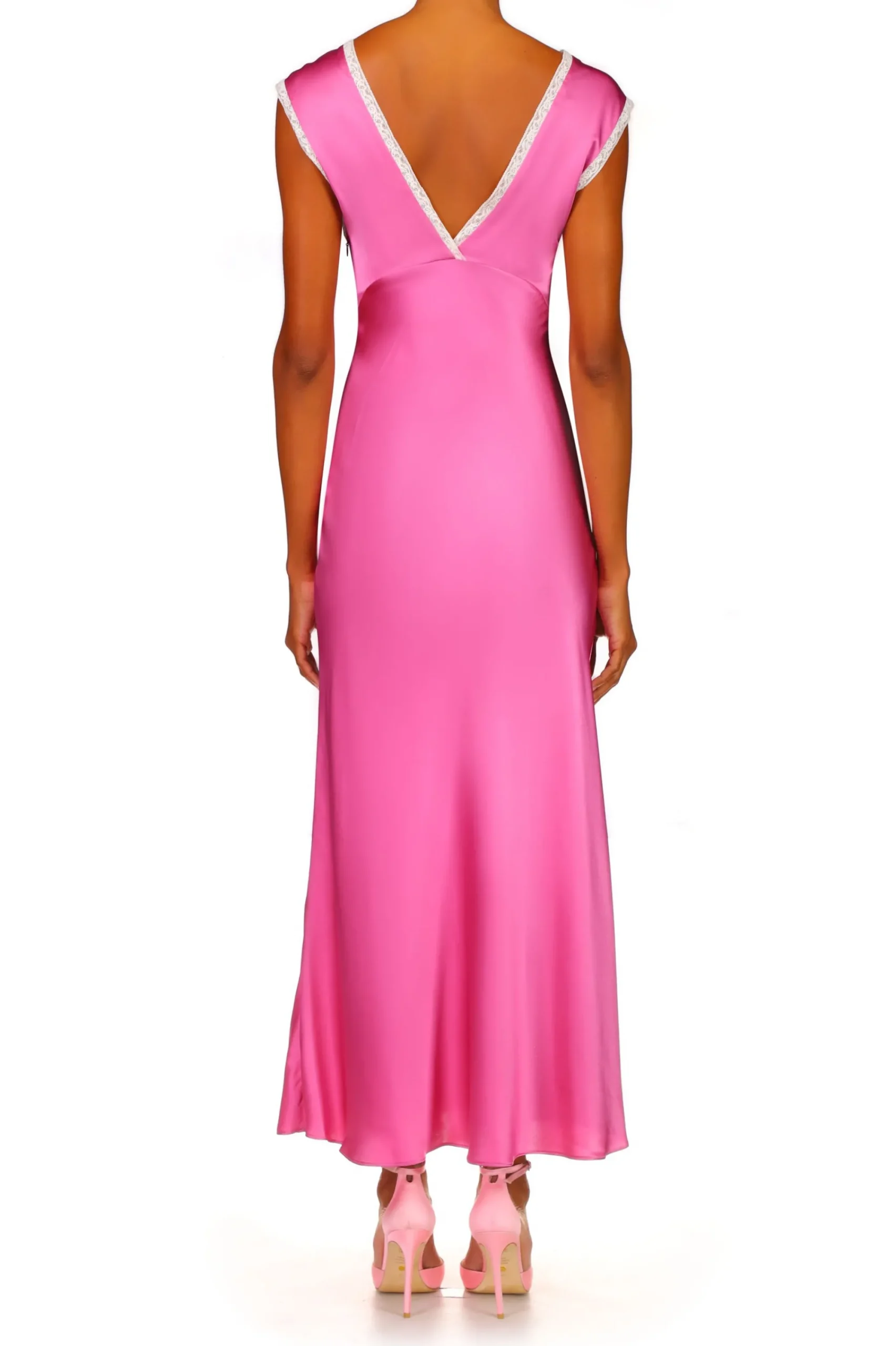With A V-Neckline Formed By Softly Shirred Triangular Cups Outlined In Cream Lace, Echoed By Wide Shirred Straps With Narrow Lace Detail, This Maxi Dress Is Crafted In Luminous Orchid Silk Charmeuse That Creates An Effortless Look. Its Bodice Inset Hugs The Midriff, Joining The Slightly Flared Bias Cut Skirt In A Curved Seam To Create A Striking Silhouette.