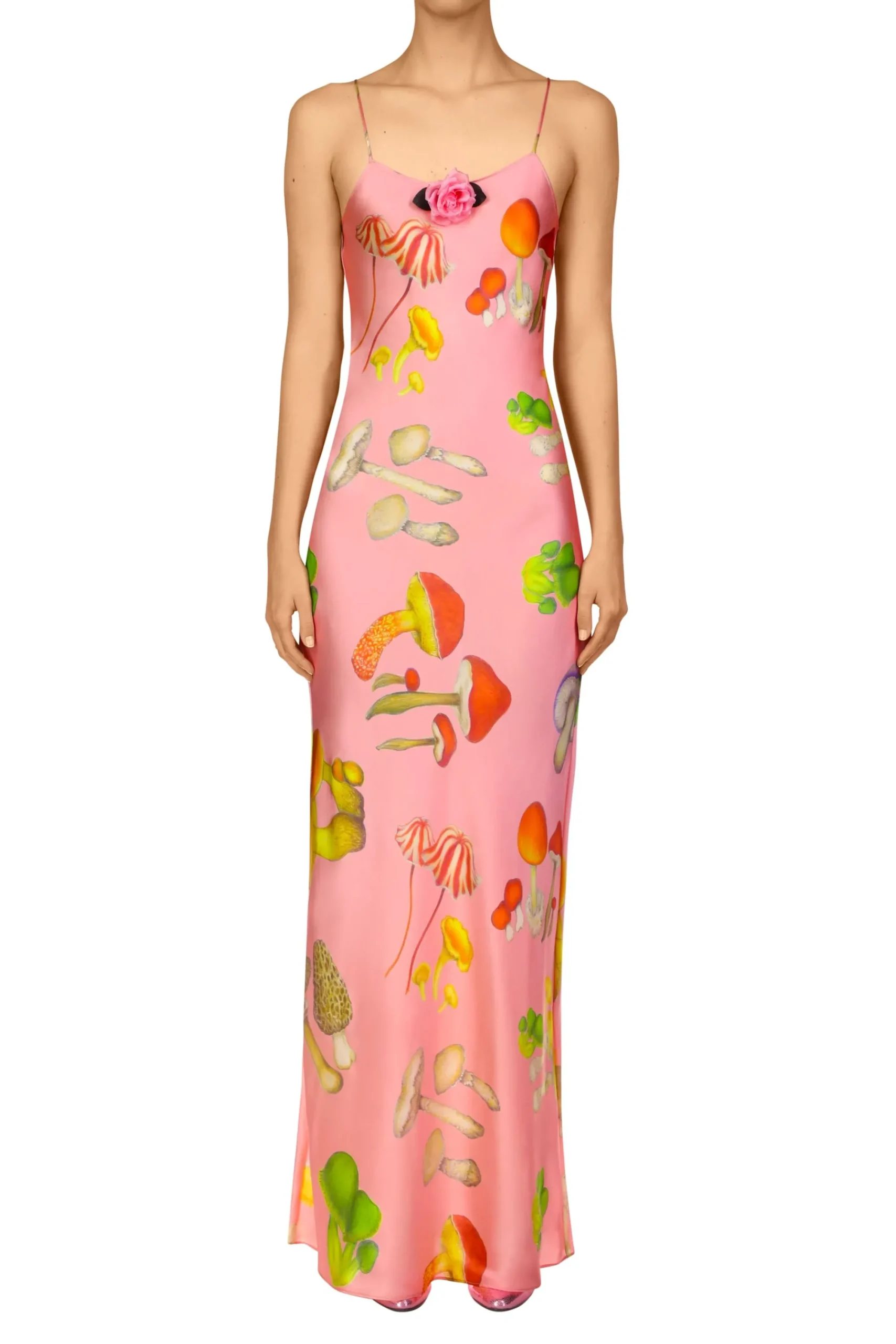 A Silk Rose Adorns The Neckline Of This Minimalist Tea Length Slip Dress. Cut On The Bias From Lustrous Pink Pure Silk Charmeuse Scattered With Irresistible Magical Mushrooms, This Maxi Offers A Streamlined Silhouette That Follows Your Body’S Curves Without Clinging.