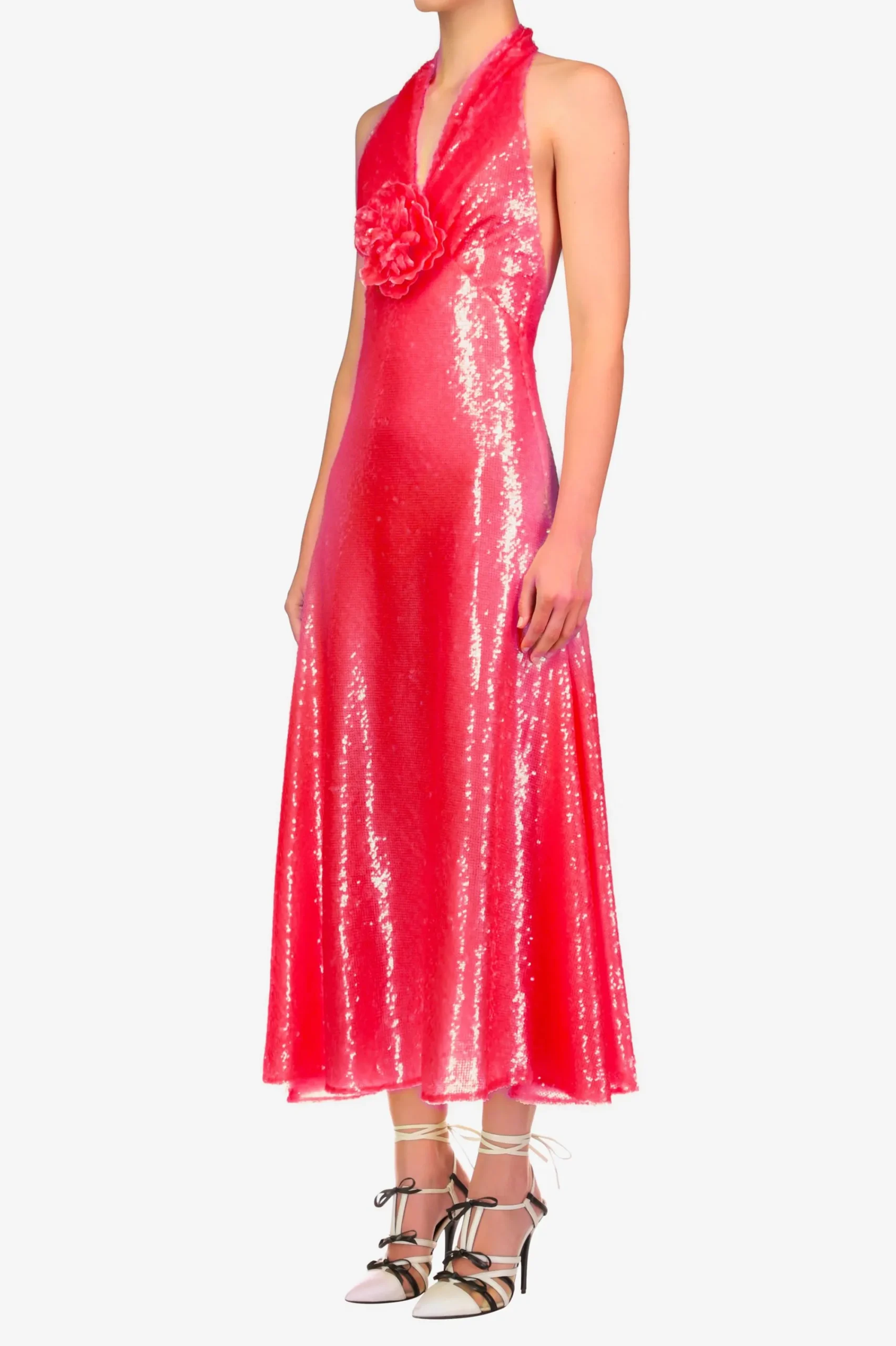 This Shimmering Dress Is Constructed Of See Through Strawberry Pink Sequins, Cut For A Flared – Ankle Skimming Hemline. Its Open Back And Halter Neckline, Embellished By A Sequined Flower Pin, Flatteringly Frame The Shoulders. Lined In Tulle For Ease Of Movement.