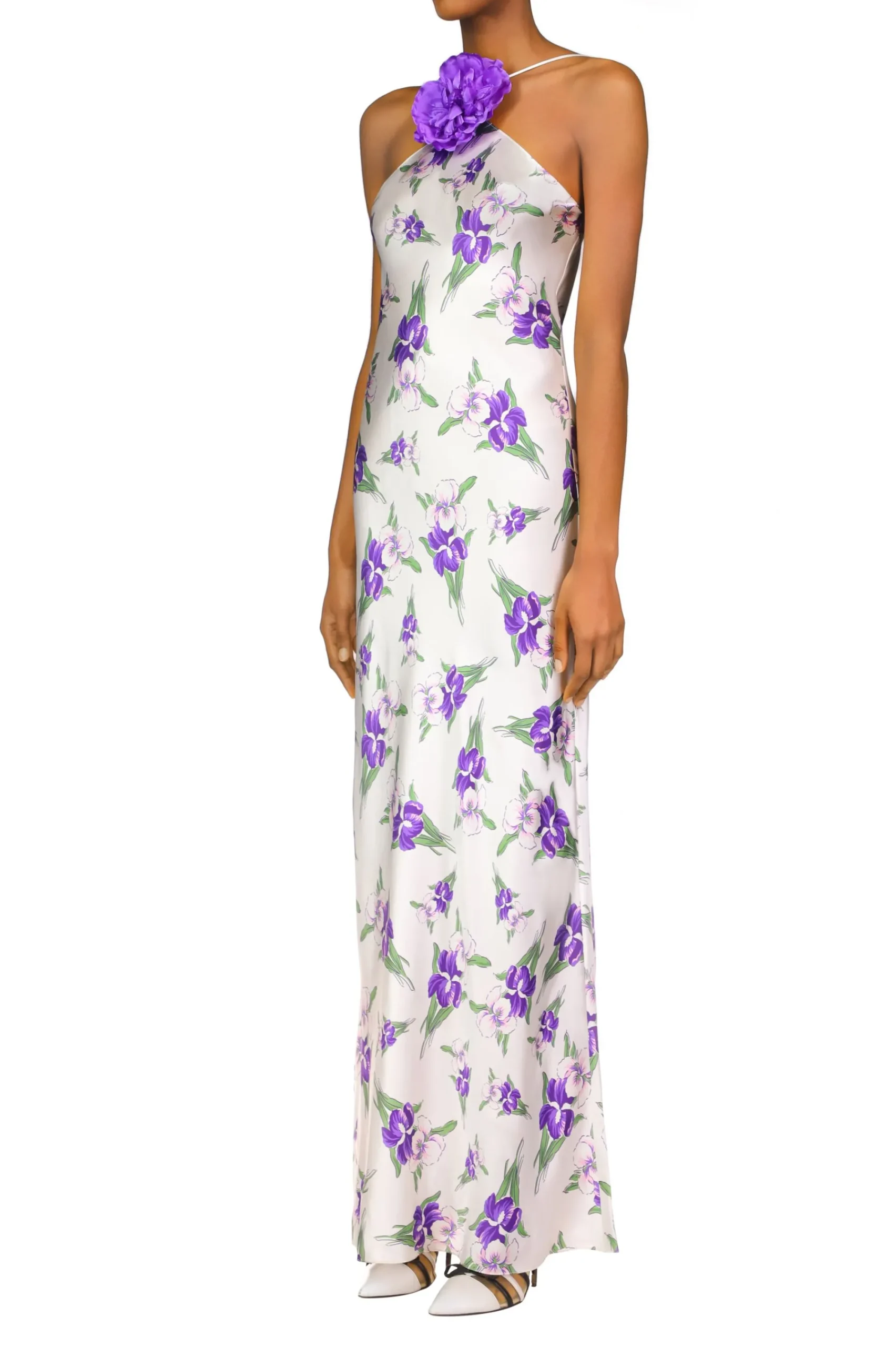 This Lustrous Gown Is Constructed Of Printed Silk Charmeuse, Cut On The Bias For A Fluid Drape Into An Ankle Skimming Hemline. Its Open Back And Halter Neckline, Embellished By A Large Hand Molded Flower, Flatteringly Frame The Shoulders. Pair This Style With Its Matching Hip Grazing Capelet.