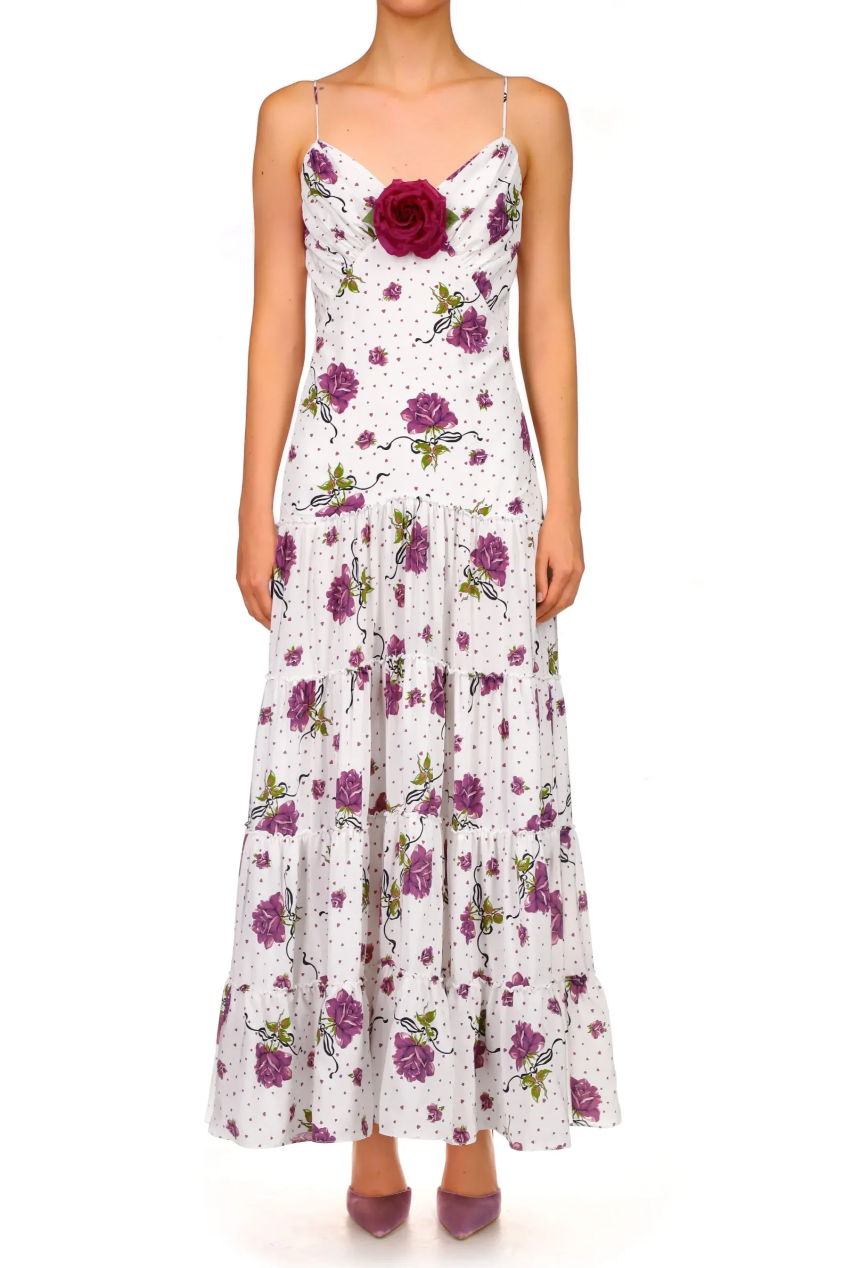 Cut On The Bias From Silk Crepe De Chine Printed With Purple Roses On A White Ground, This Maxi Dress Has A Flattering Empire Neckline Punctuated By A Single Hand Molded Purple Silk Rose Pinned At The Neckline. It Gracefully Flares From The Hip Into Tiers Of Ruffles.
