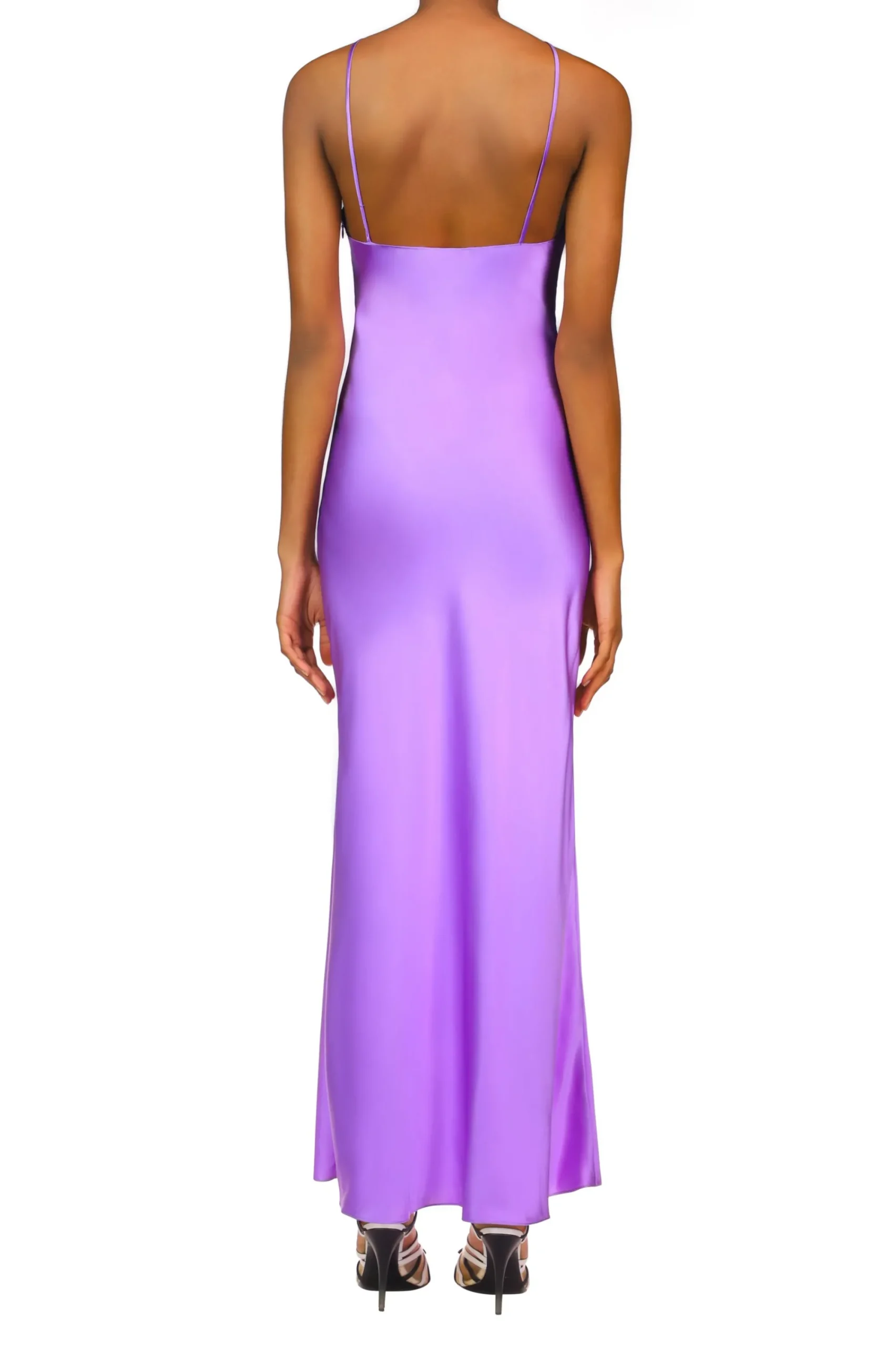 Cut On The Bias In Lustrous Purple Silk Charmeuse, This Bias Cut Dress Features A Ruched Empire Cut, Echoed By An Elasticized Halter Neckline, That Closes Together With A Large Silk Rosette. The Empire Waistline Gently Flares Into A Maxi Length With A Graceful Drape.