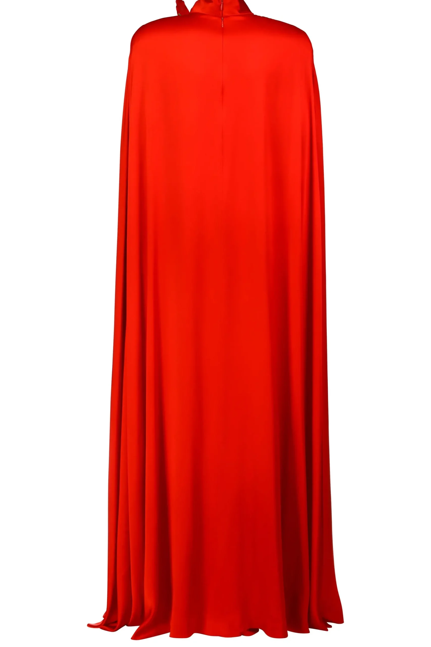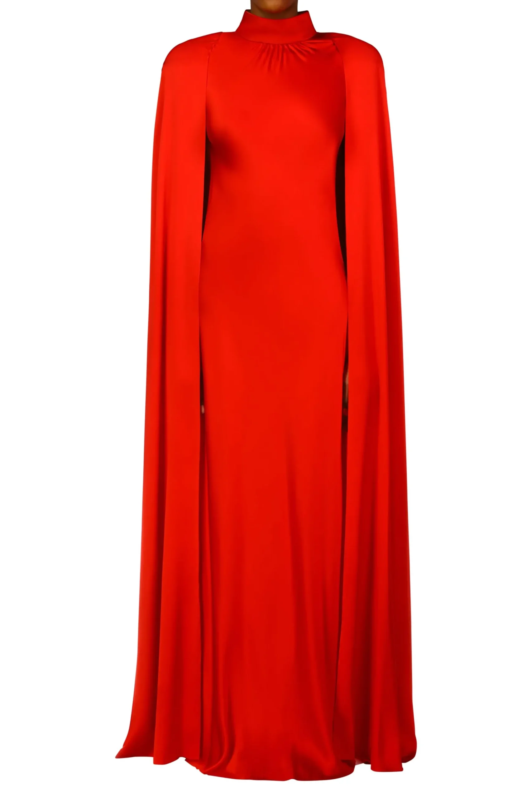 Slip On This Elegant Cape Gown For Soft, Flowy Movement. Cut On The Bias From Lustrous Red Silk Charmeuse, Its Clean Lines Flow From A Simple Mock Turtle Neckline That Make It A Breeze To Wear. Flower Pin Is Removable.