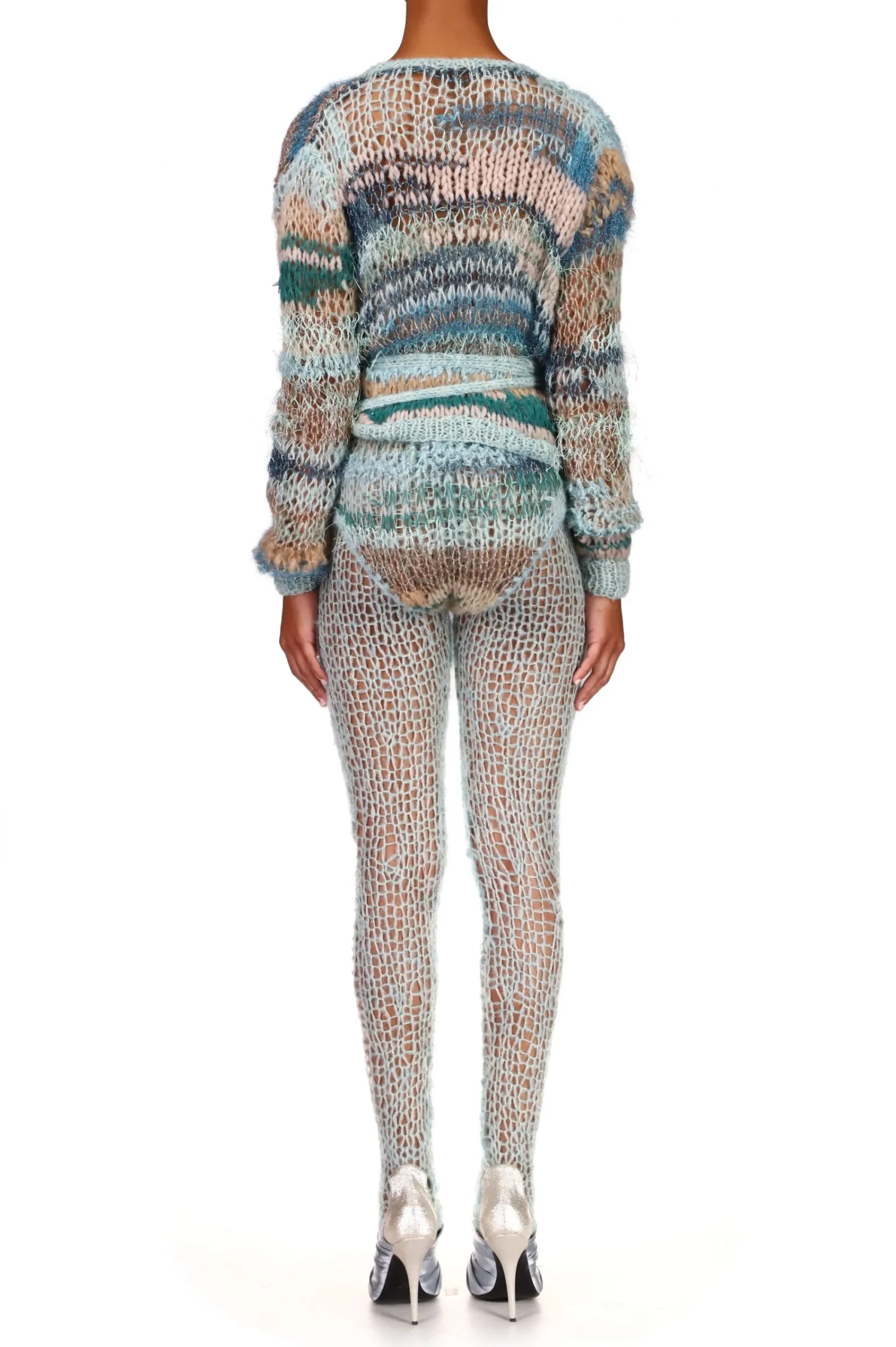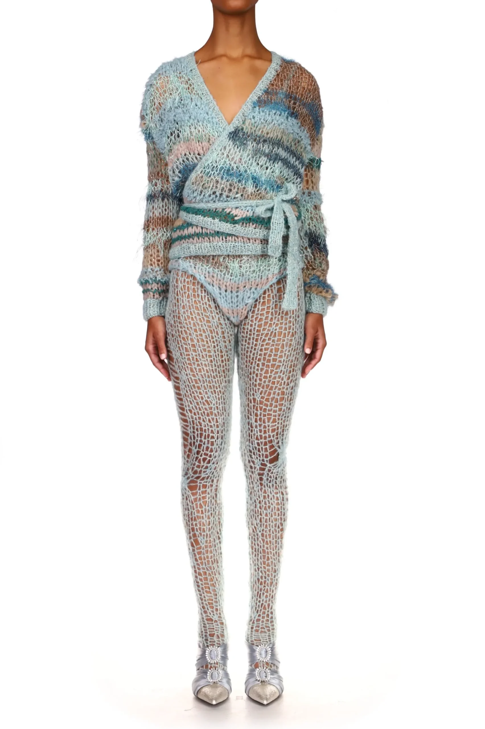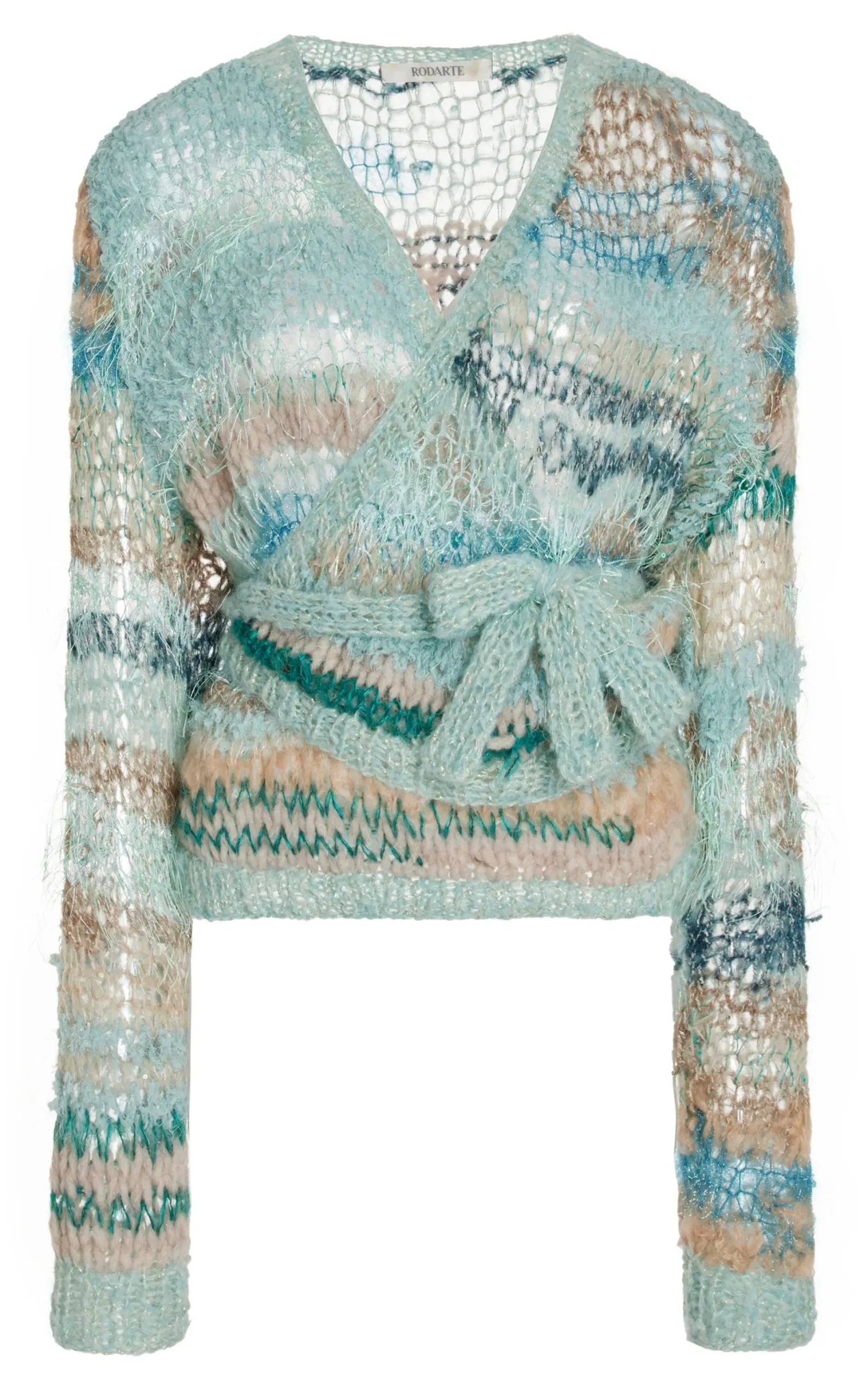 Our Iconic Hand Knits Are Back. Inspired By Ballet’S Chic Style, This Long Sleeve Wrap Sweater With Drop Shoulders Is Hand Knitted In A Variegated Seafoam Blue-Green Mohair/Alpaca/Silk Yarn Blend. A Self-Tie Wraps Around The Waist To A Bow In Front For A Flattering Silhouette.