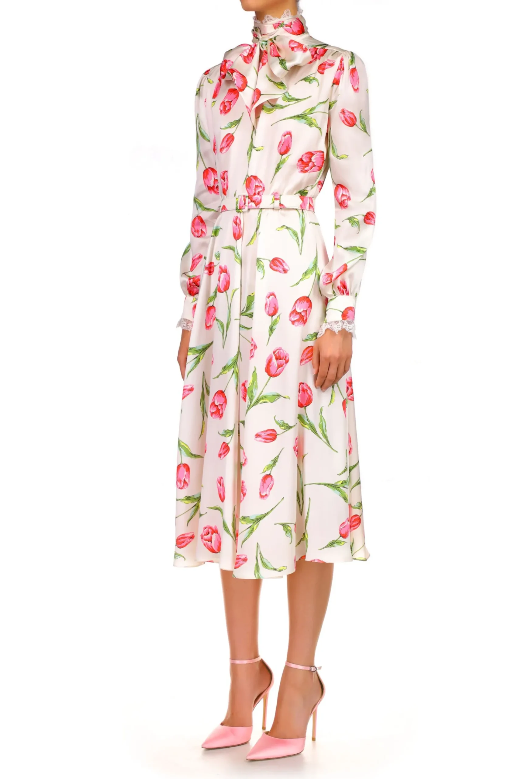 Fresh And Modern, This Romantic Tea Length Dress Is Cut From Off White Silk Charmeuse Printed With A Delicate Tulip Print. Featuring A Sash Tie Atop Its Lace-Edged Standup Neckline, A Self-Belt And Slightly Puffed Long Sleeves Gathered By Wide Cuffs Edged With Delicate White Lace, It’S A Striking Day Look That Gracefully Transitions Into The Evening.