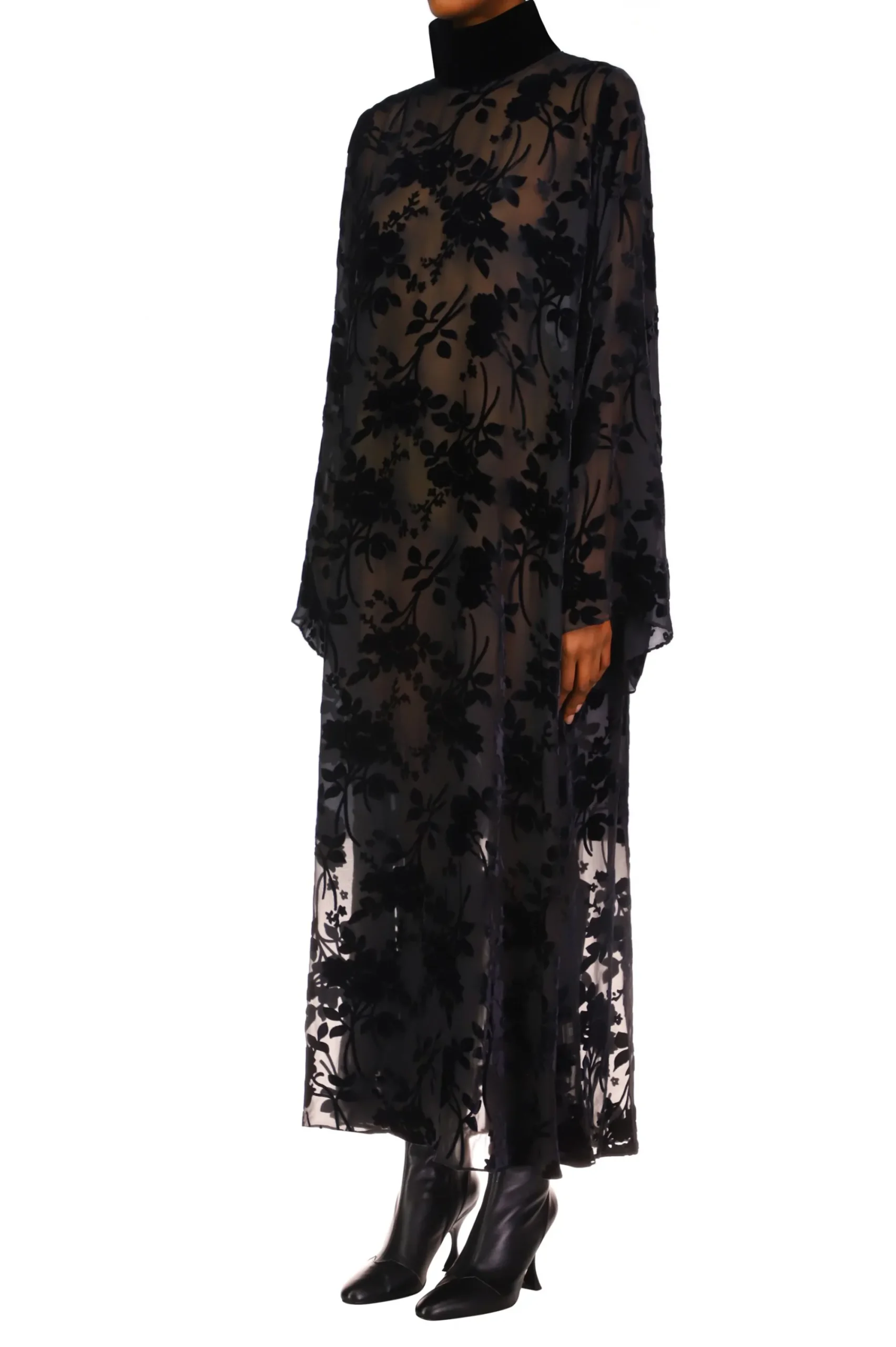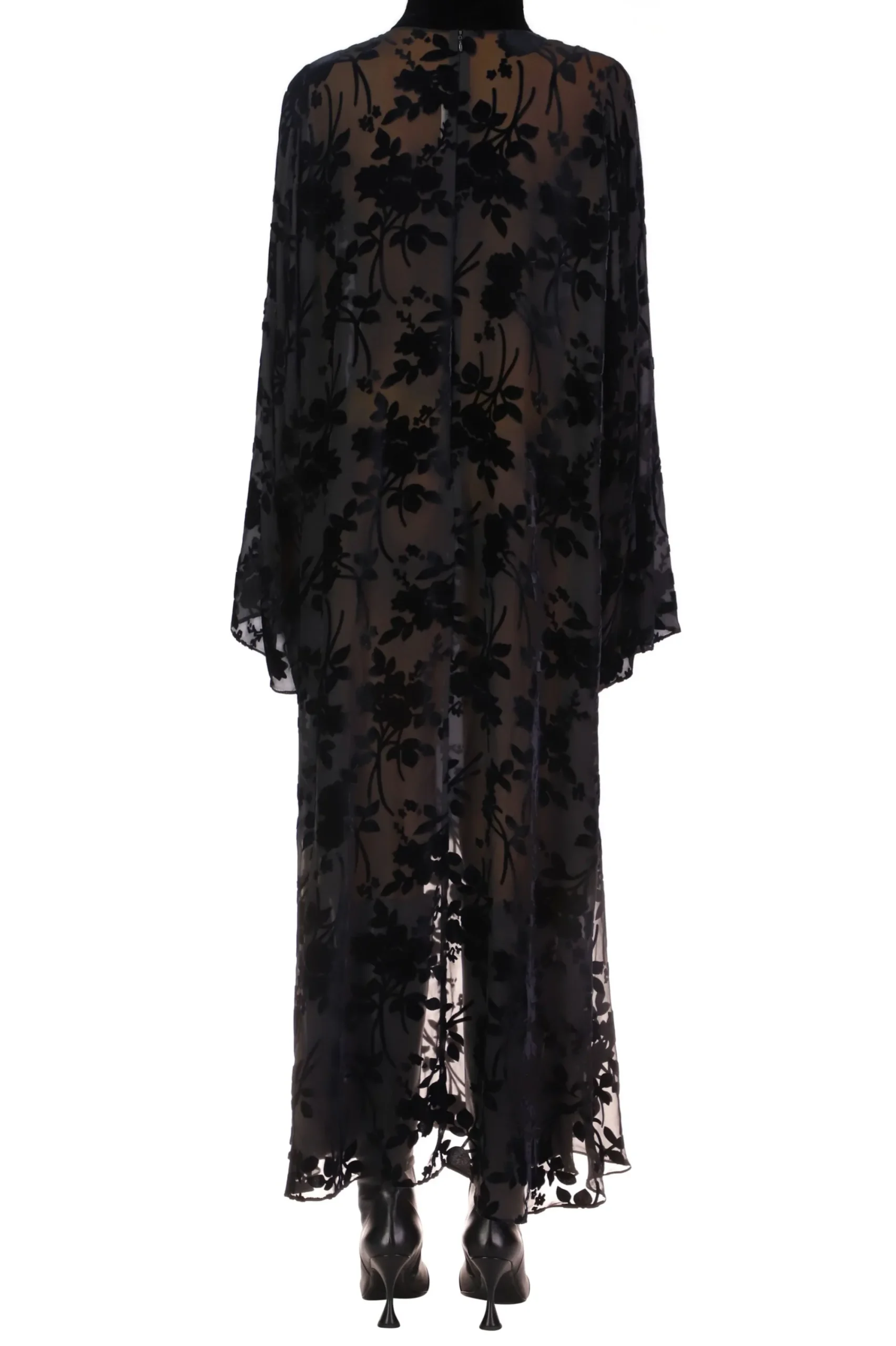 This Airy Tunic Is Cut From Sheer Black Burnout Velvet That Drapes Beautifully Over Your Frame. It Features A Wide Black Velvet Band Collar, Long Sleeves That Float Beyond The Wrist And An Asymmetric Floor-Skimming Hemline That Dips Down At The Sides.