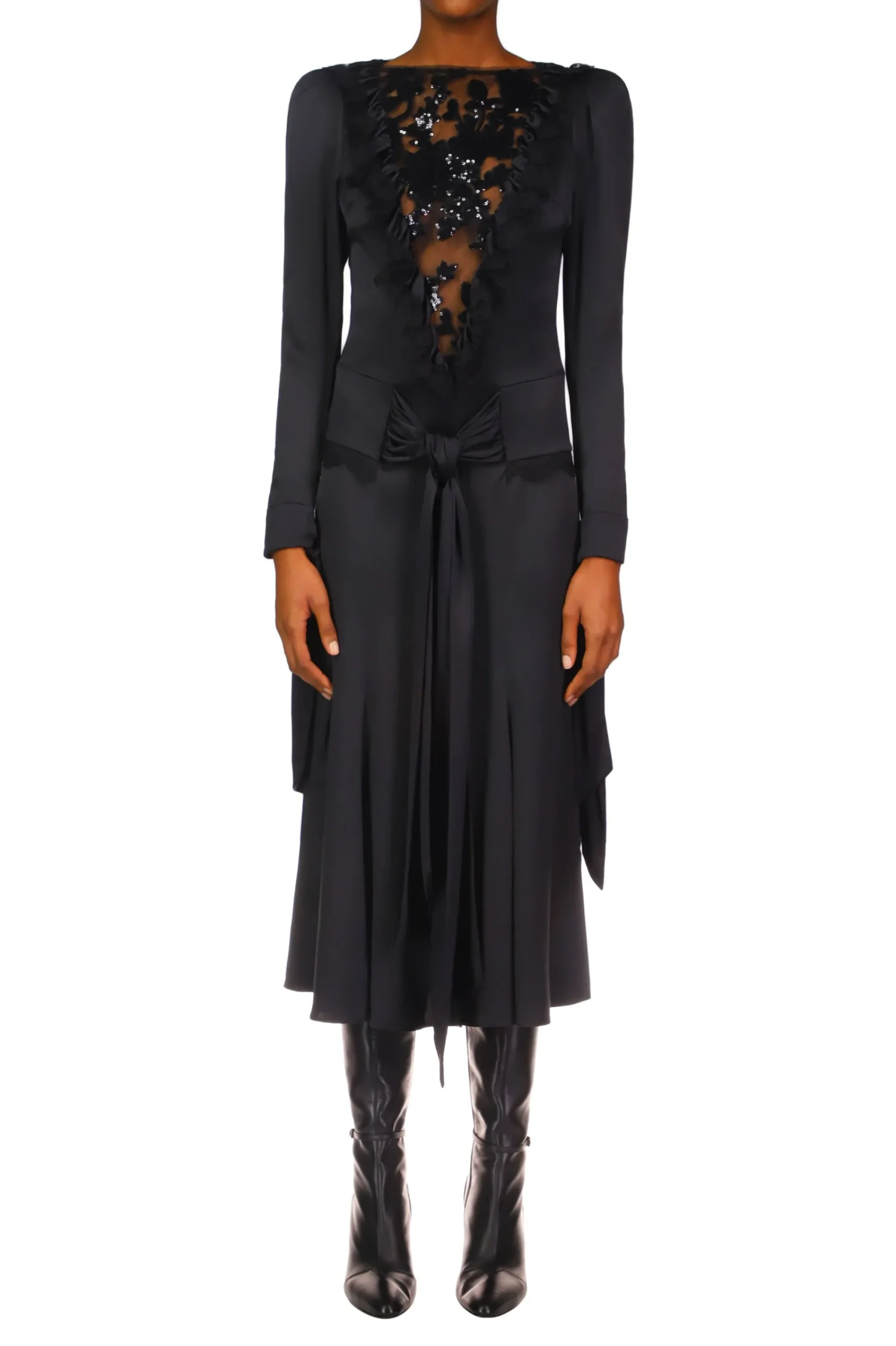 Cut From Black Silk Charmeuse, This Long Sleeve Tea Length Dress Exemplifies Beauty In Motion. It Features A Bodice With A Deep V Inset Of Sheer Black Sequin Tulle Trimmed In Shirred Black Charmeuse Edged In Black Lace. Its Dropped Waistline Is Created By A Black Lace-Edged Yoke With Ties In The Front To Create A Long Sash. Black Charmeuse Ties Spill From A Band At The Wrist Of Each Sleeve, Echoing The Movement Of The Sash.