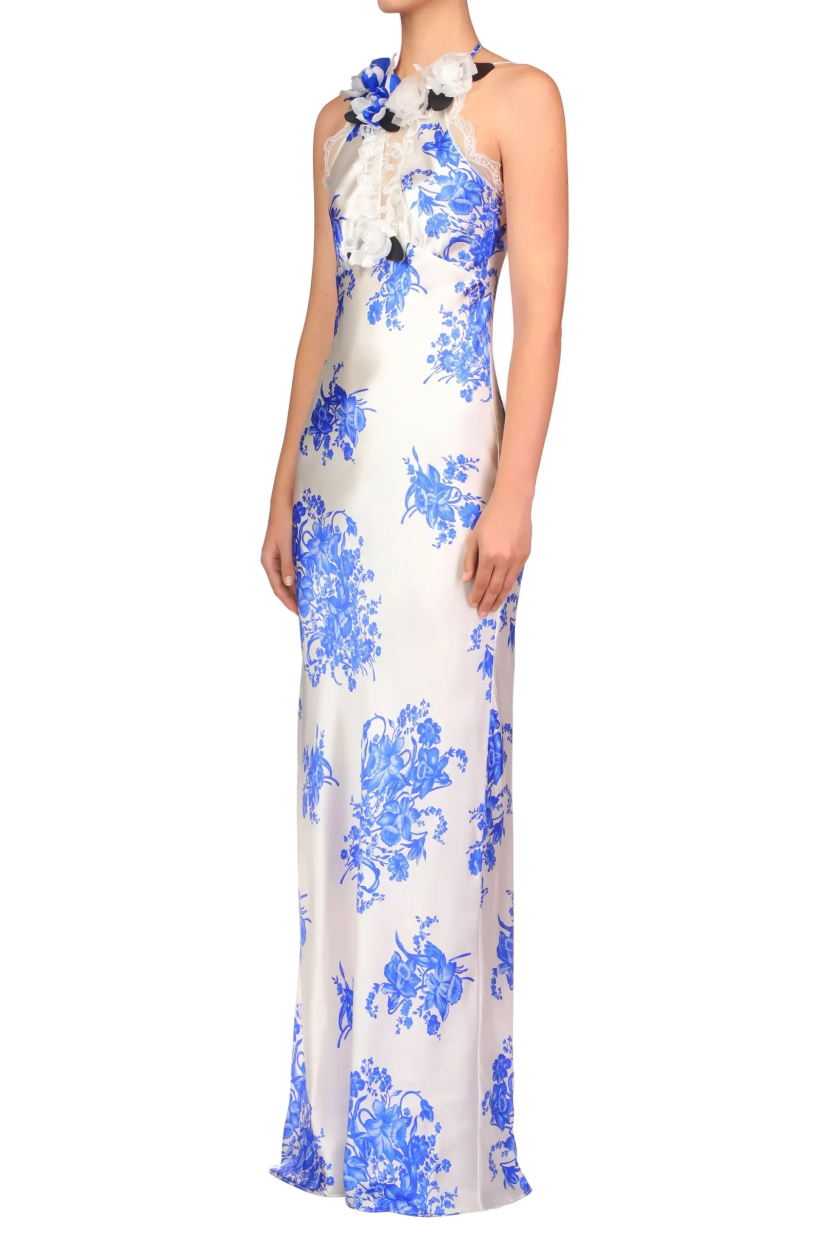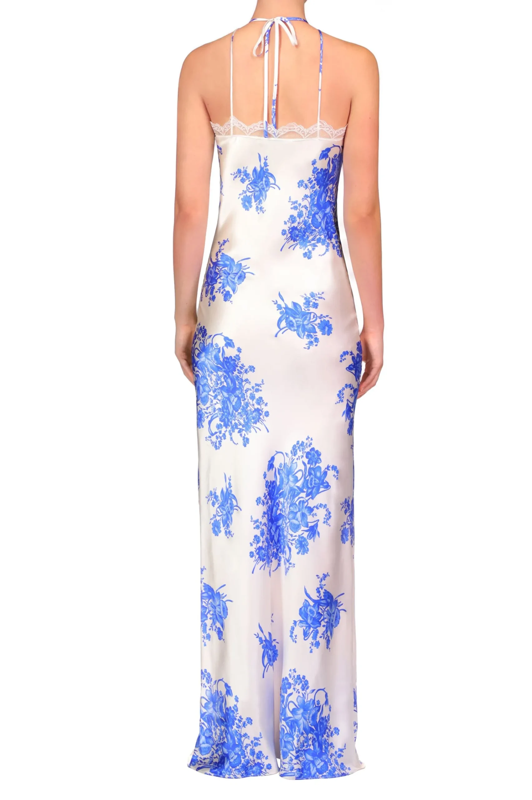 Cut On The Bias In Lustrous Blue And White Floral Printed Silk Charmeuse, This Bias Cut Gown Features An Inlay Of Intricate Gossamer Lace Lace, Echoed By Ruffles Of White Lace Trim Along The Halter Neckline. The Empire Waistline Has Thin Ribbons Of Silk That Tie In The Back For A Slim Fit That Gently Flares To A Maxi Length.