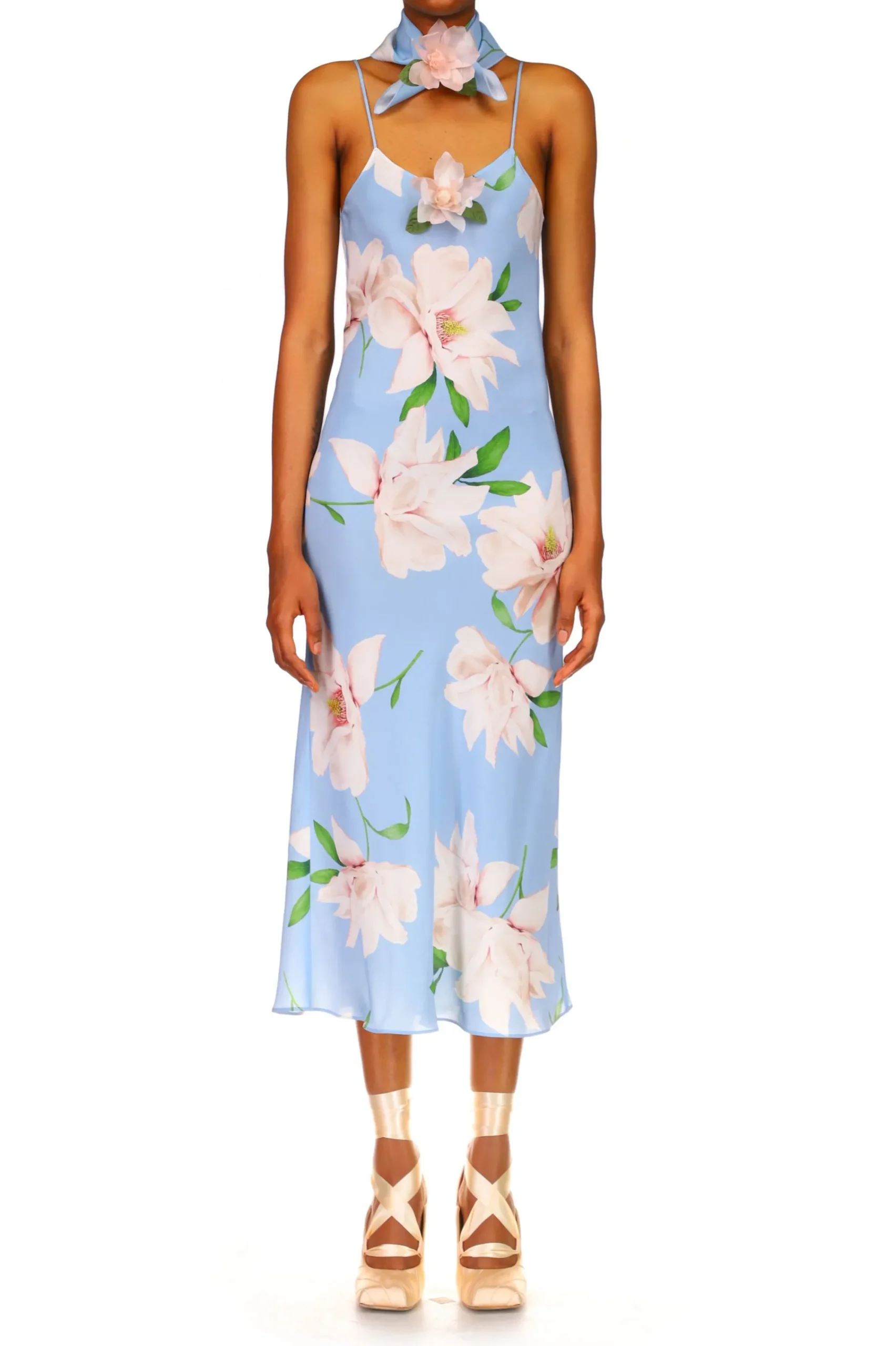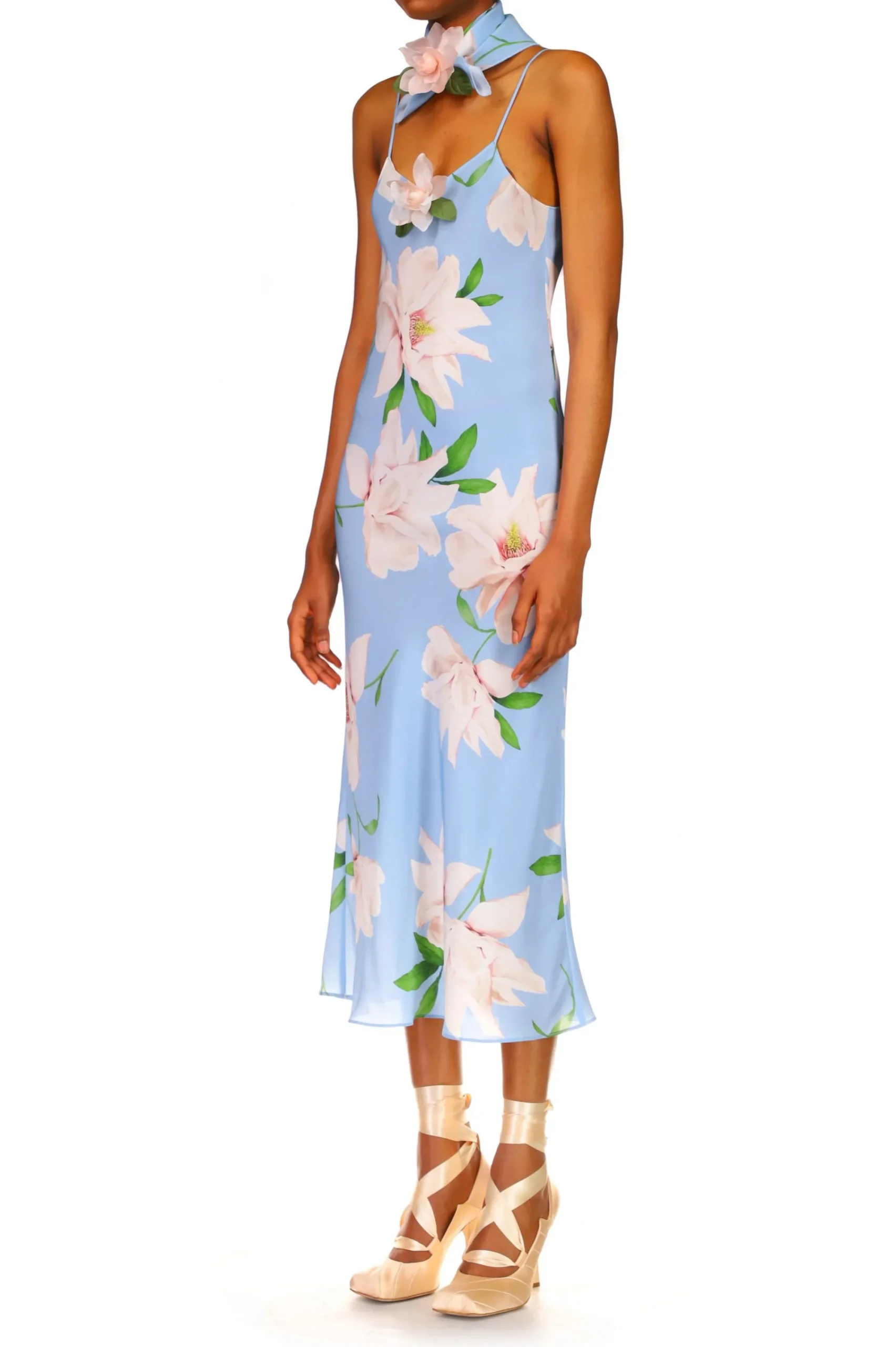 A Hand Molded Silk Flower Adorns The Neckline Of This Minimalist Slip Dress. Cut On The Bias From Blue And White Floral Printed Silk Crepe De Chine, This Tea Length Dress Offers A Streamlined And Feminine Silhouette.