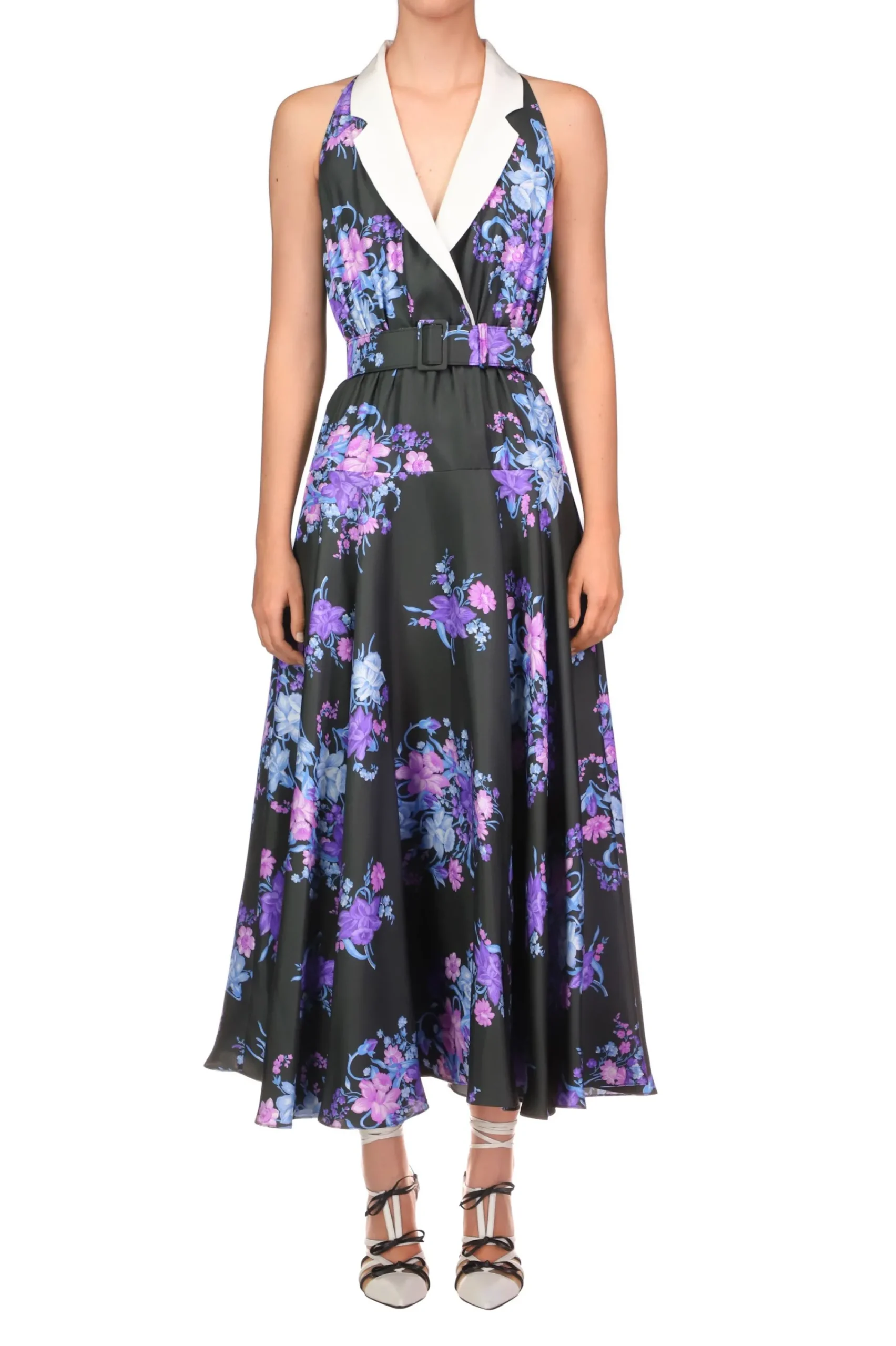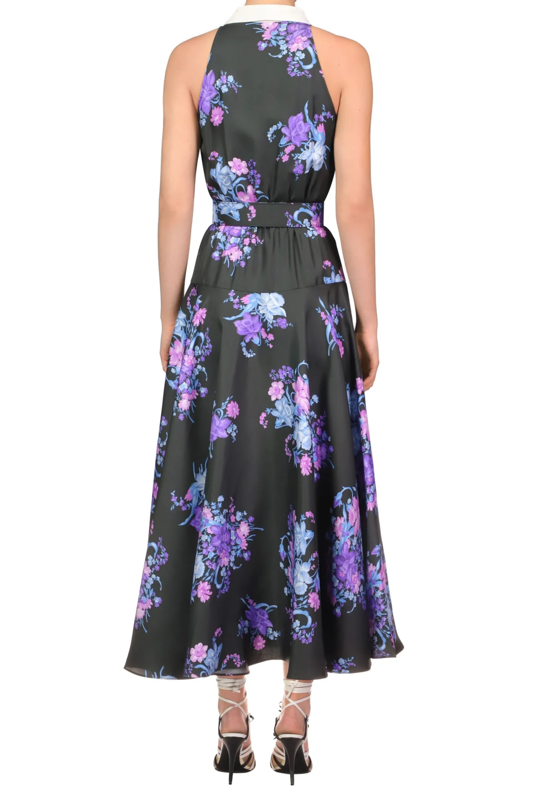 This Intriguingly Feminine Midi Cut From Elegant Silk Twill With A Floral Print Is Accented With A White Silk Crepe De Chine Notched Collar And Halter Neckline. Neatly Tailored With A Waist-Cinching Self-Belt, The Yoke Circle Skirt Creates Graceful Movement With Your Every Step.