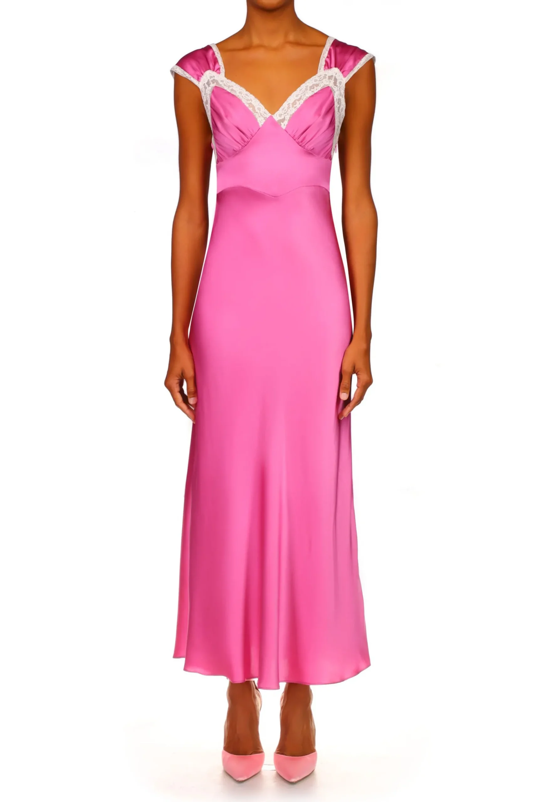 With A V-Neckline Formed By Softly Shirred Triangular Cups Outlined In Cream Lace, Echoed By Wide Shirred Straps With Narrow Lace Detail, This Maxi Dress Is Crafted In Luminous Orchid Silk Charmeuse That Creates An Effortless Look. Its Bodice Inset Hugs The Midriff, Joining The Slightly Flared Bias Cut Skirt In A Curved Seam To Create A Striking Silhouette.