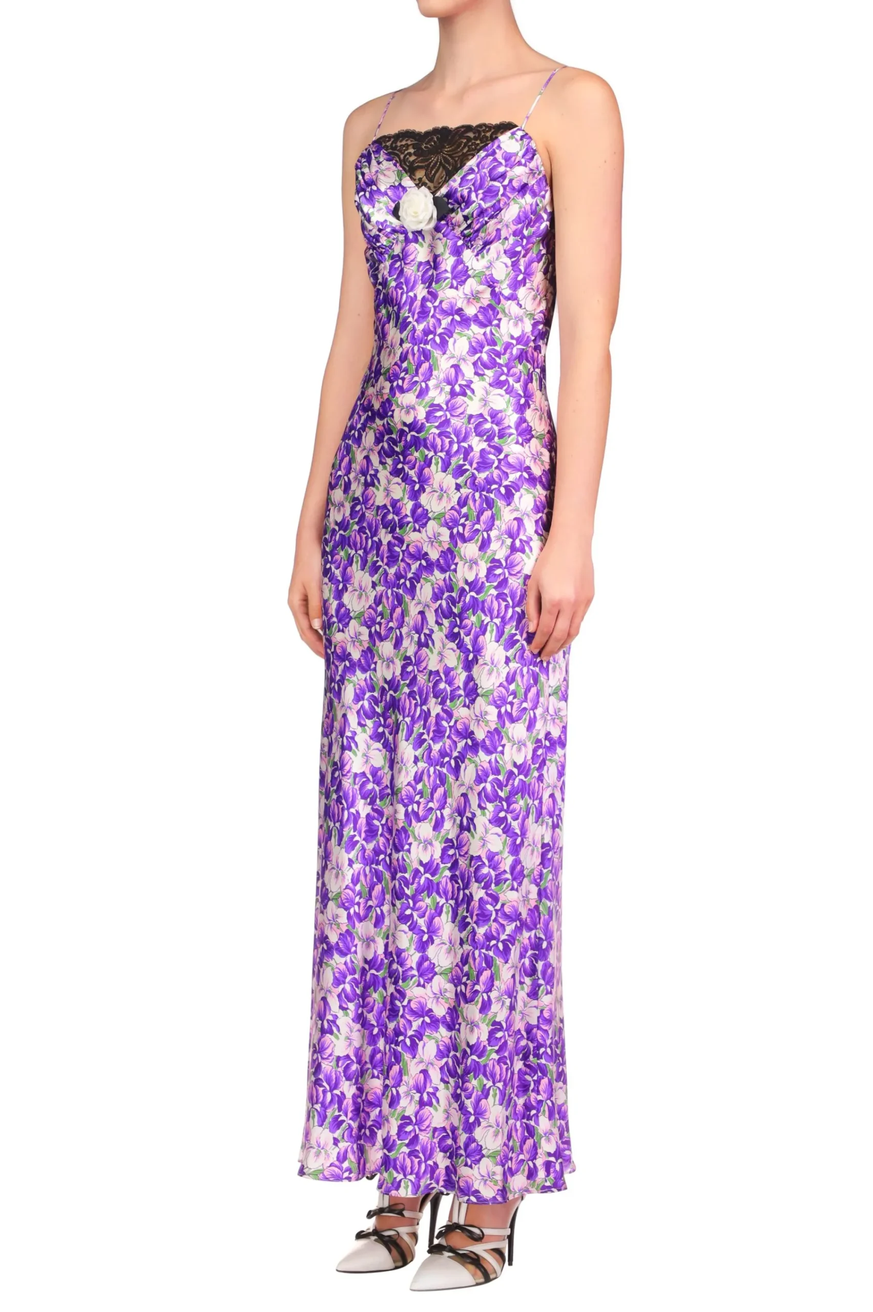 Cut On The Bias In Lustrous Purple And White Floral Printed Silk Charmeuse, This Bias Cut Dress Features A Yoke Of Black Lace, Echoed By Sheered Charmeuse On The V- Neckline, And Is Accented With A Silk Rosette. The Empire Waistline Gently Flares Into A Maxi Length With A Graceful Drape.
